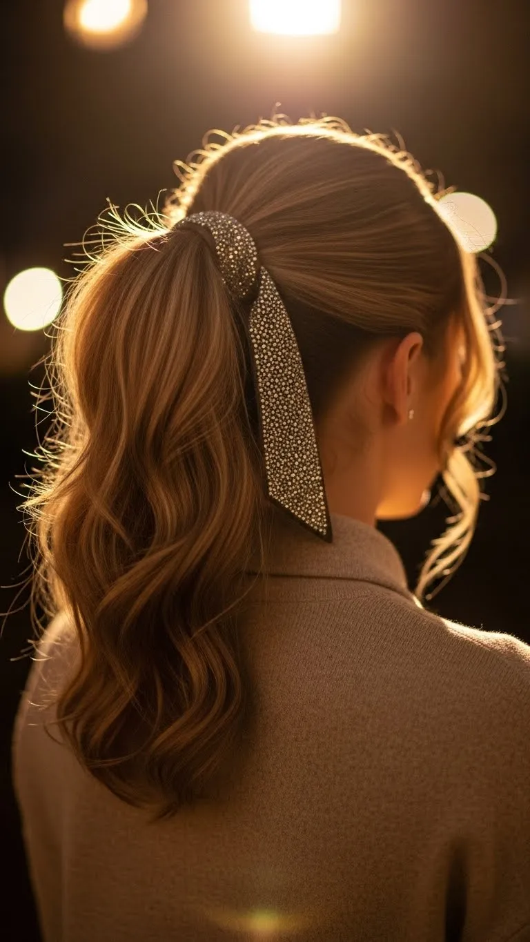 A high ponytail feels lively and easy to wear. Pull the hair up and secure it with a soft elastic. Let a few strands fall around your face. You can wrap a thin ribbon around the base for color. If your hair is heavy, use a stronger elastic so it stays lifted. This style works for all hair types. It stays comfortable through the night and feels fun without needing extra tools.