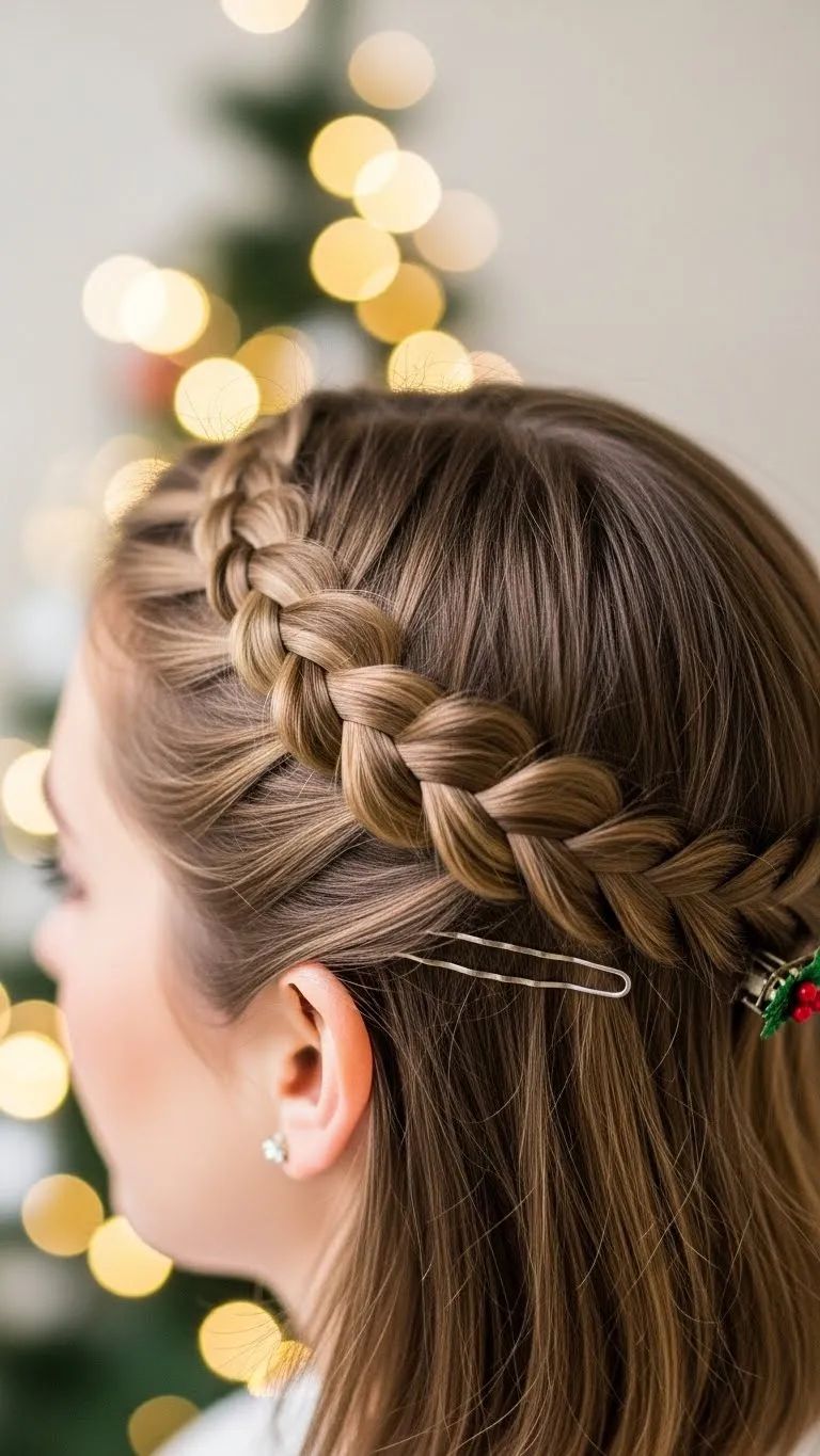 A small braided crown adds a delicate touch. Take a thin section behind the ear, braid it, and bring it across the head. Secure behind the opposite ear. You can find tiny bobby pins at any beauty supply store. This style looks detailed but takes only a few minutes. If your hair is short, use a smaller braid. The braid sits comfortably all night. Add a tiny clip near the ear for holiday color, but keep the look soft and natural.