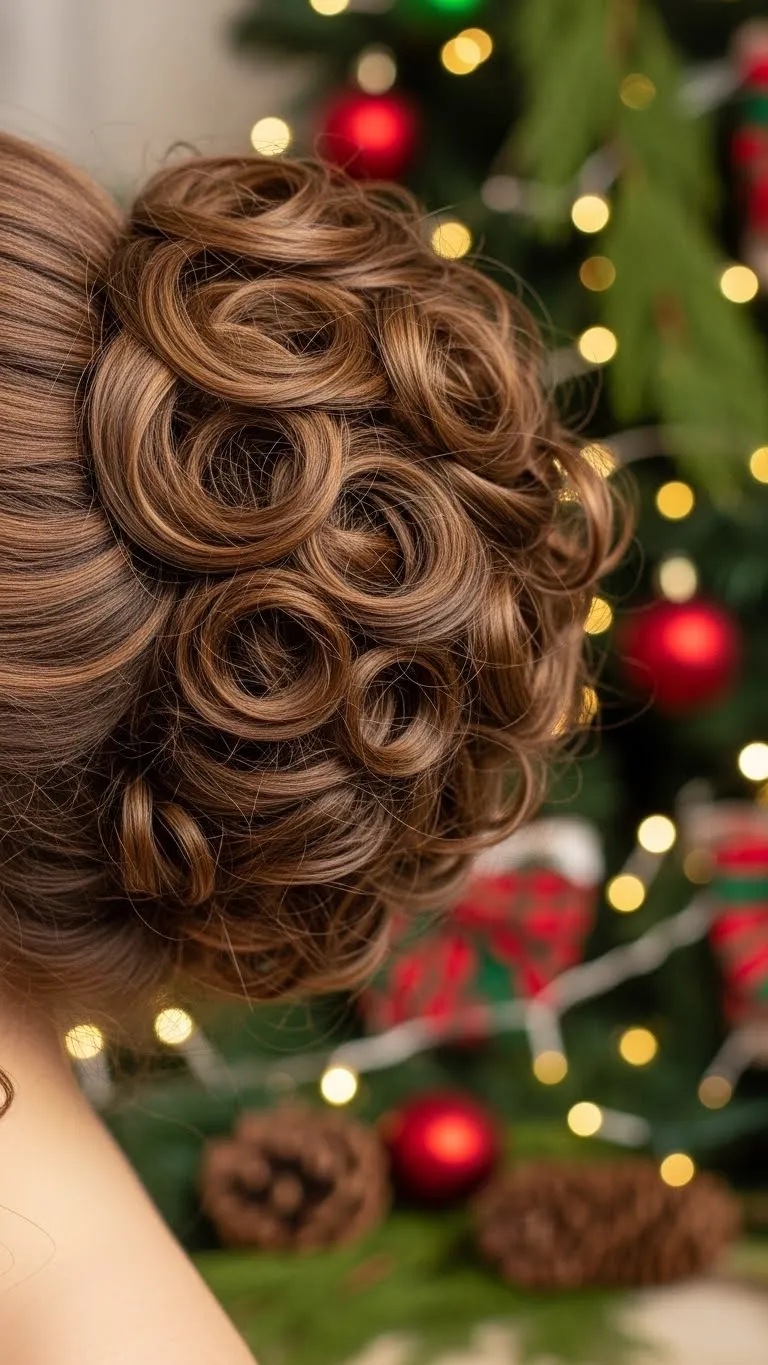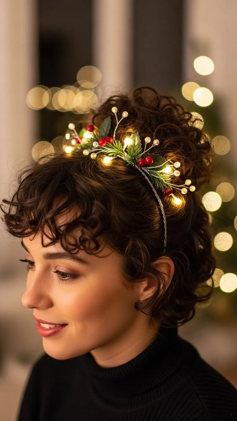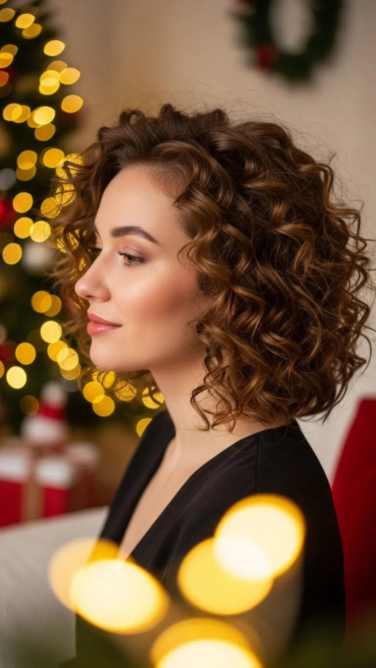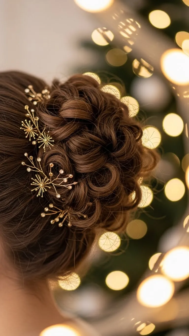 A curly bun becomes festive with tiny gold pins. Make a loose bun and slide in the accessories wherever you like. They catch the light for a gentle sparkle. Use a small amount of gel to smooth flyaways. This works with long or short curls. Even if your bun isn’t perfect, the gold details keep it cute. It’s a low-cost way to look holiday-ready.