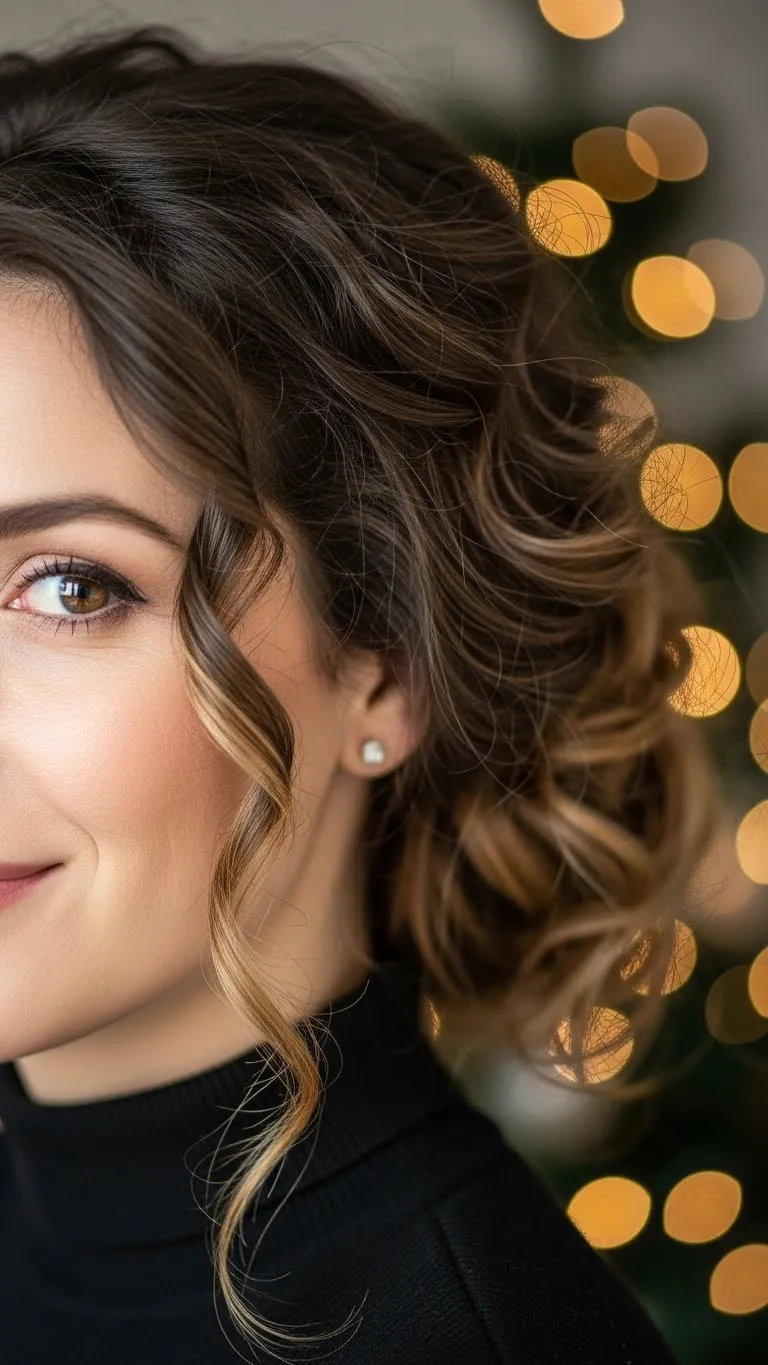 Sweep all curls to one side and secure gently with bobby pins. Define a few curls with your fingers. This gives a soft, romantic look. Add a decorative clip near the ear. Style on damp hair if you want longer curls. This is great for dresses with one shoulder shown. It’s simple and pretty for any holiday event.