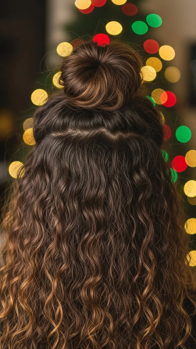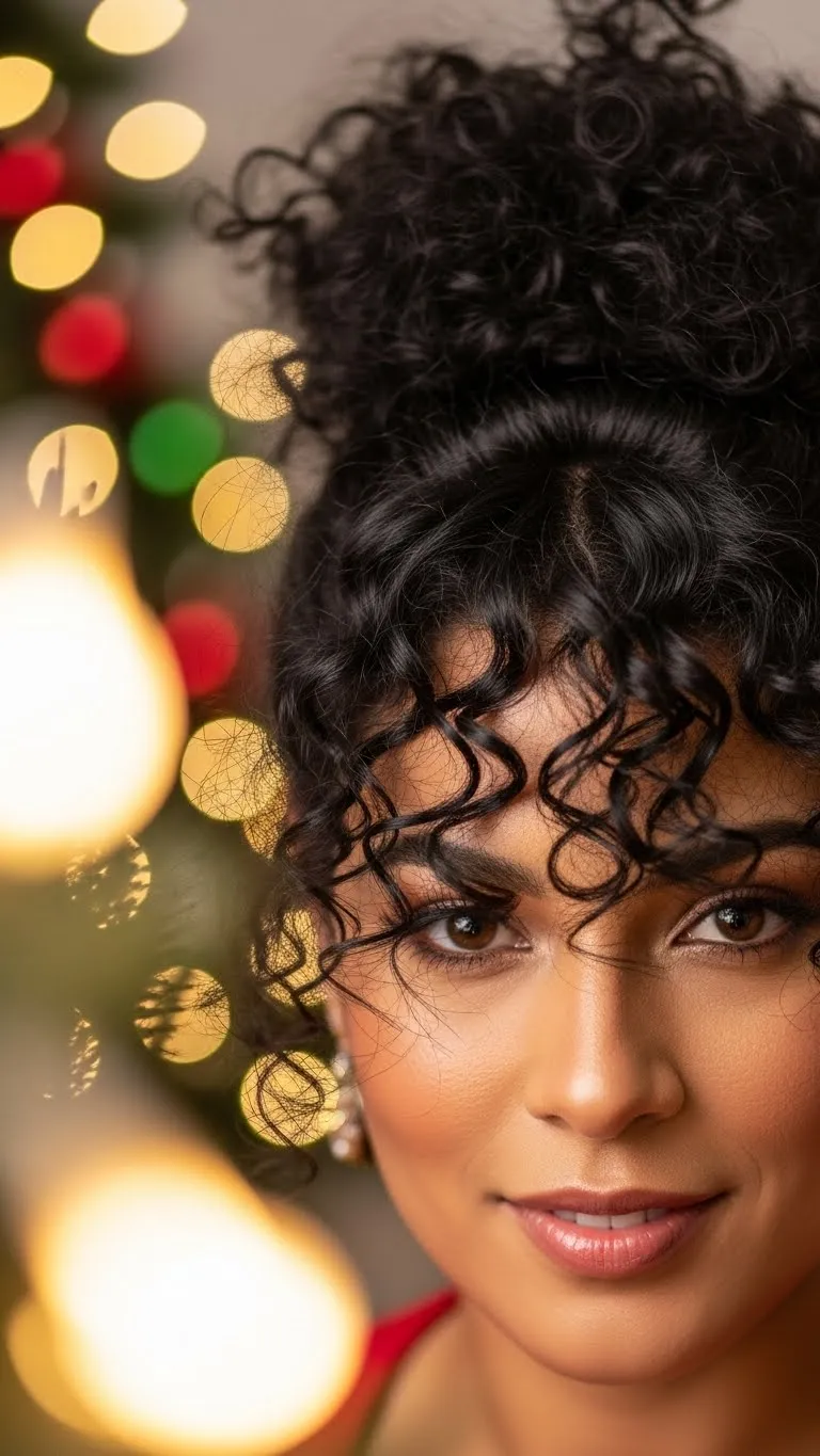 A half-up top knot gives height but still shows your curls. Scoop the top half of your hair and twist it into a small bun. Keep it loose so it has soft shape. The bottom curls stay free. Refresh curls with a little water and cream. This works well if you want your hair out of your face but not fully tied up. Add a ribbon for a festive touch. Easy, cute, and budget-friendly.