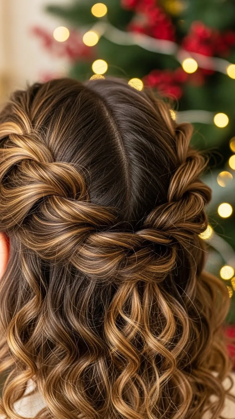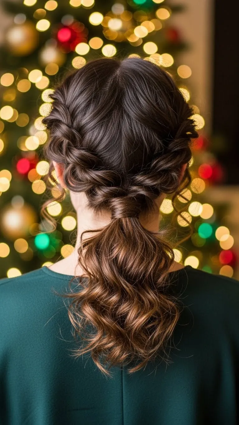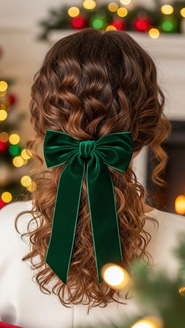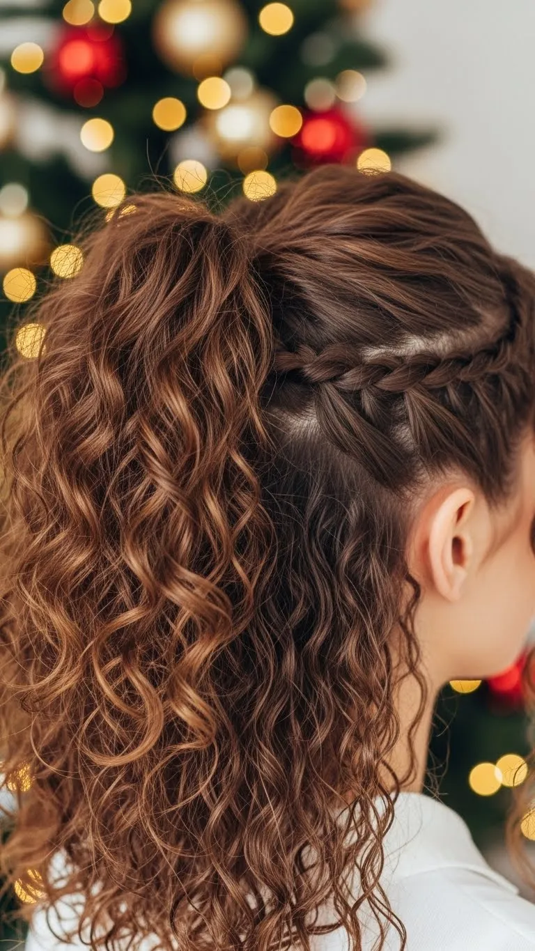 Twist both sides and secure them into a ponytail. Let the curls fall naturally. Use a velvet ribbon for the holiday feel. Smooth the front with gel if you like neat edges. This style is easy and works well for long or medium curls. It’s fast, tidy, and festive.