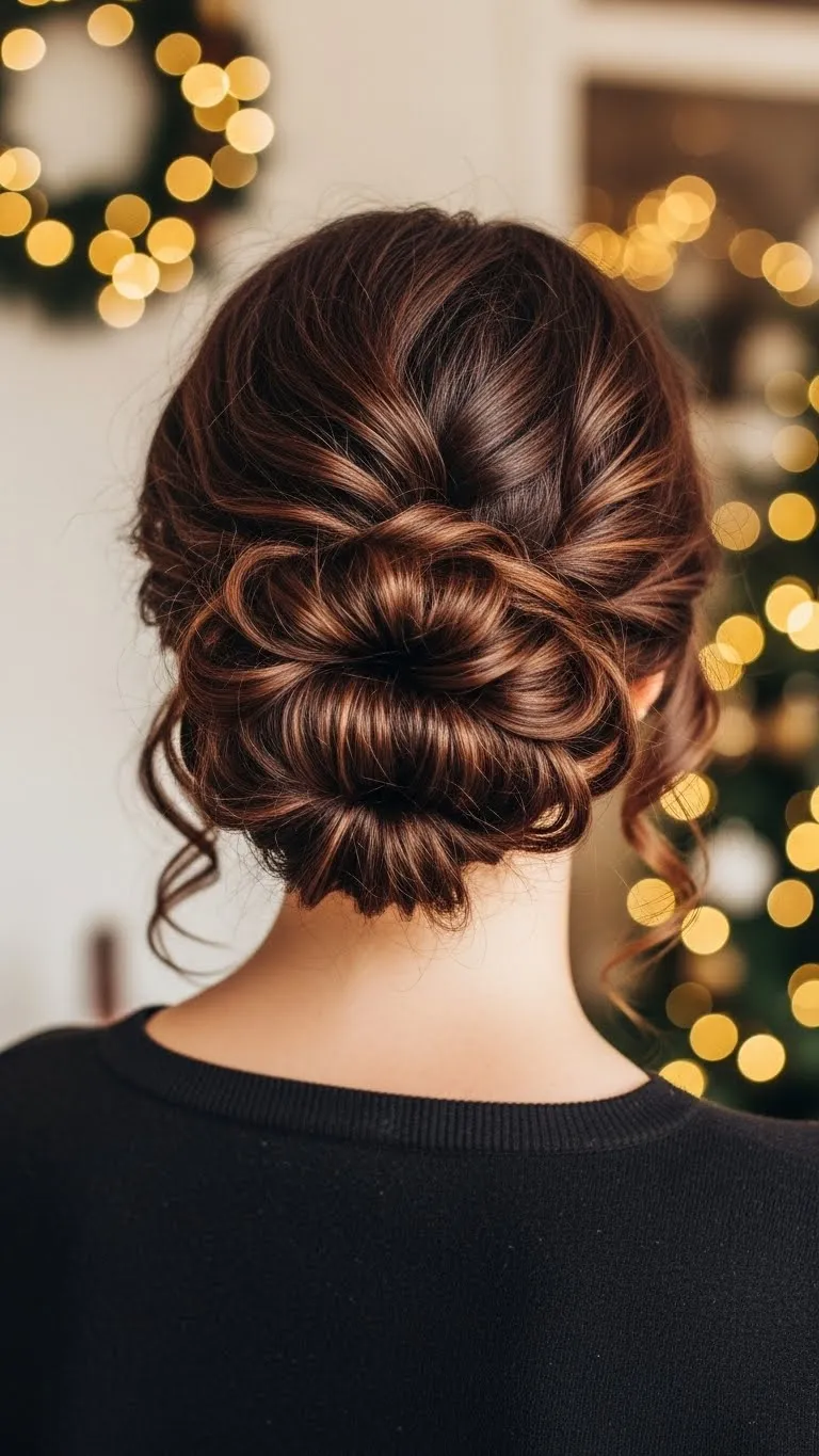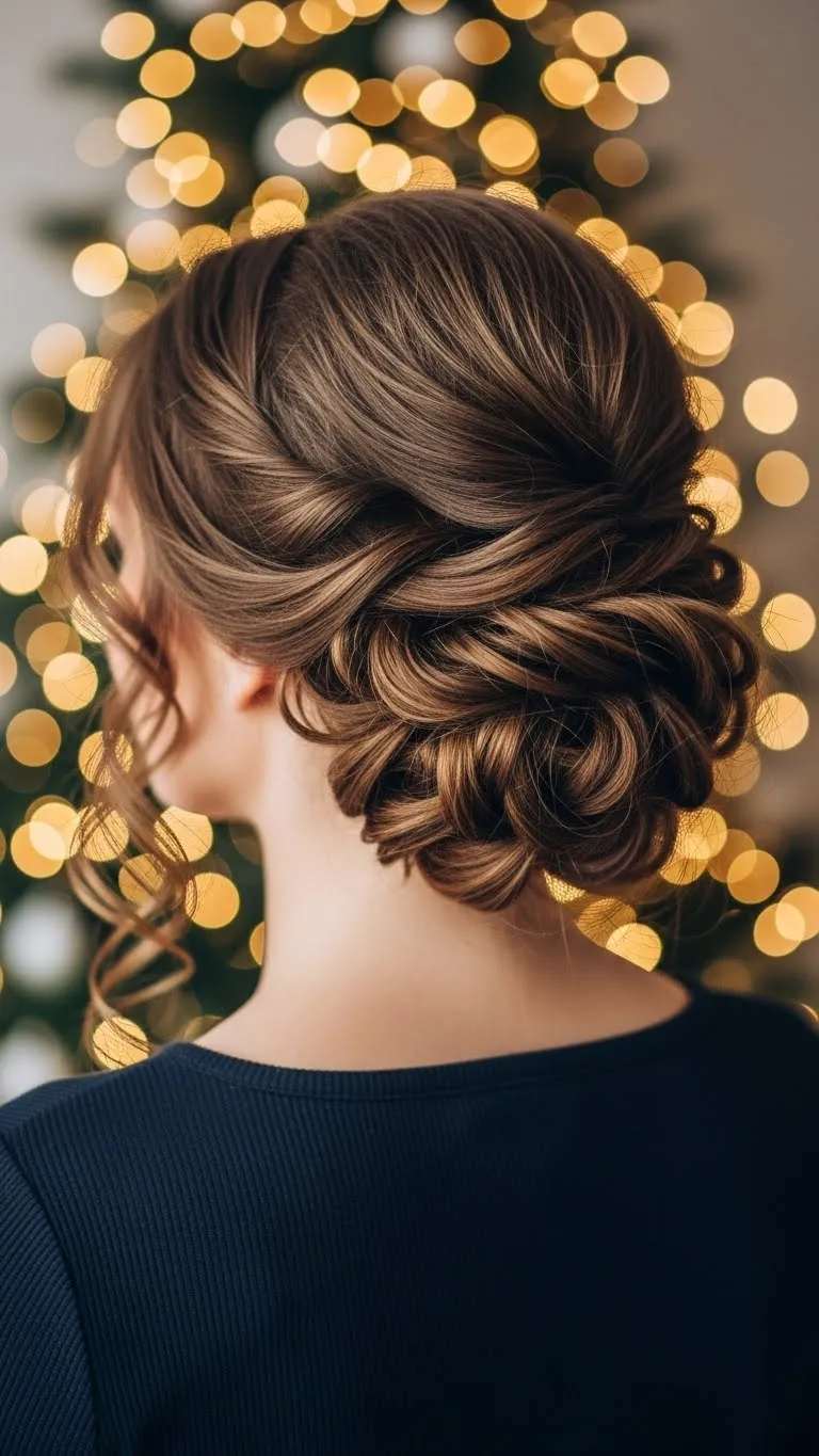 A soft low curly bun works well for any holiday event. Keep the front loose so your curls fall naturally. This gives the style a relaxed, warm vibe. Gather your curls at the nape and twist them lightly before pinning. Don’t pull tight. A few bobby pins are enough. Add curl cream if your hair feels dry. For a budget touch, wrap a thin ribbon around the bun. If you want extra shape near the face, twirl small bits with your fingers. This look takes about five minutes, so it’s a great last-minute option. If your curls shrink when dry, style on damp hair for more length.
