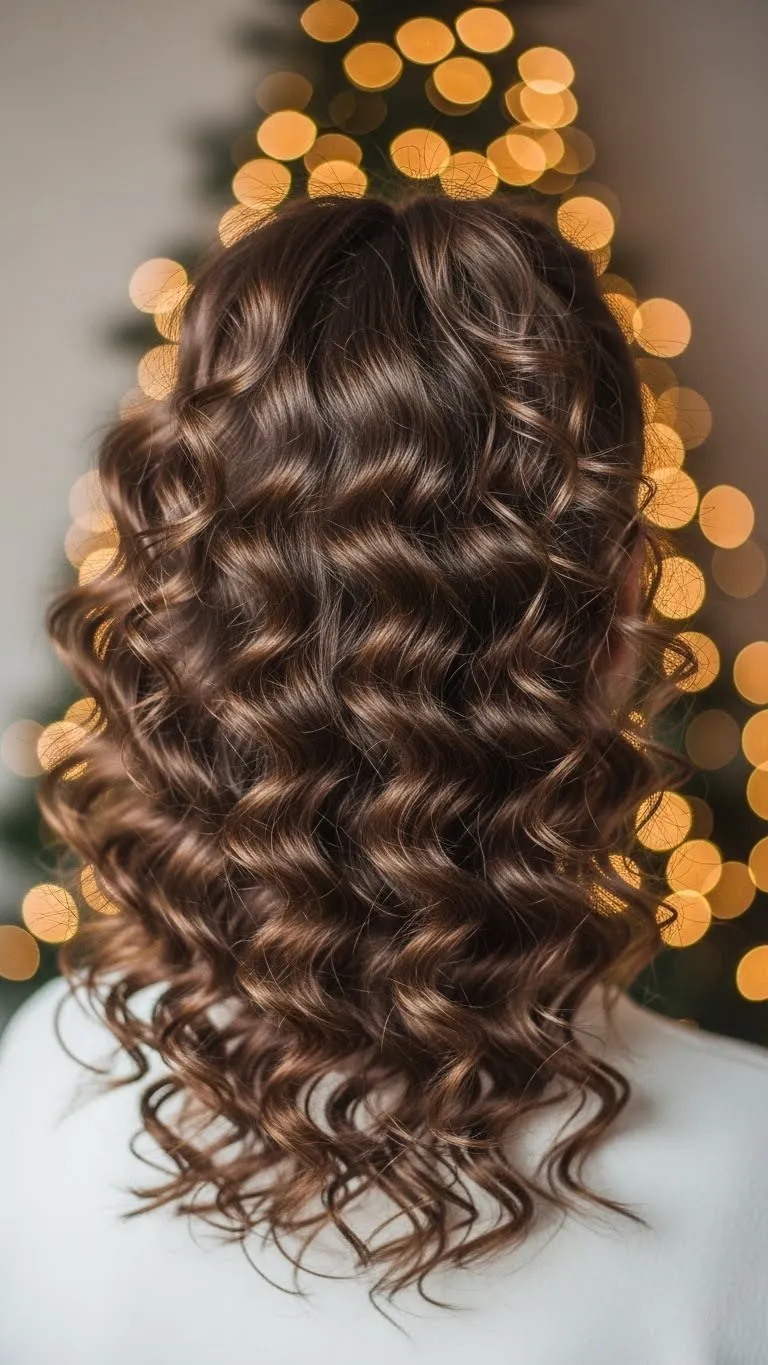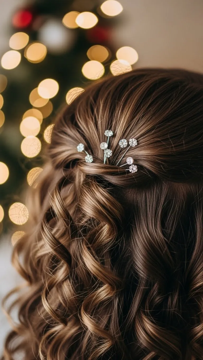 Twist two large sections from the sides and pin them together at the back. Let the curls fall naturally. This gives height while keeping hair away from your face. Add a soft clip or small holiday pin. Refresh curls with water if needed. It’s quick, soft, and flattering.