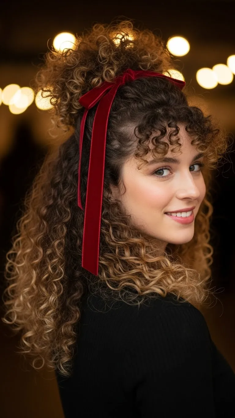 A half-up curly puff gives height without heavy work. Scoop the top section of your curls and secure it with a small elastic. Fluff it gently to add soft shape. Tie a simple ribbon around the elastic for a holiday feel. Choose a ribbon color that fits your outfit—red for classic, green for playful, or gold for something warm. A small amount of gel keeps the front neat. This style works great on stretched or shrunken curls. If you want it fuller, shake the curls at the root. The best part is how quick it is. You need only an elastic, a ribbon, and a dab of moisture.