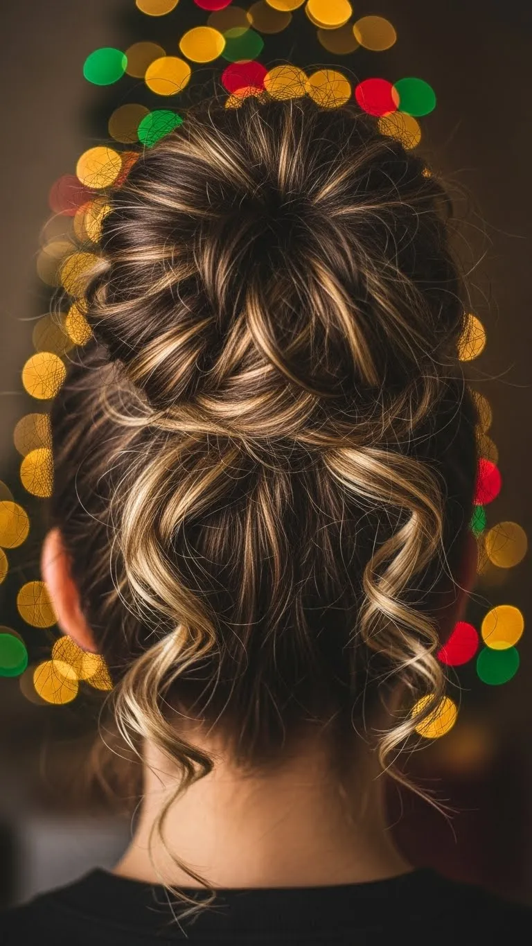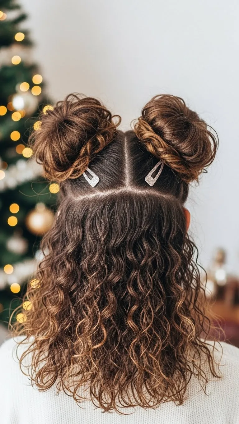 Space buns feel playful for holiday events. Part the hair down the middle. Create two high buns. Keep them loose so curls show. Leave small curls by the ears for softness. Add glitter clips if you want something extra. This style works well for casual gatherings and fun photos. It’s quick, cute, and affordable.