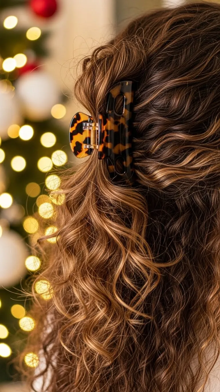 A claw clip makes styling simple. Gather curls and twist upward. Secure with a sturdy clip. Let the curls fall over the top. Add a holiday-colored clip if you have one. Refresh curls with a little water. This style takes less than a minute and looks soft and relaxed.
