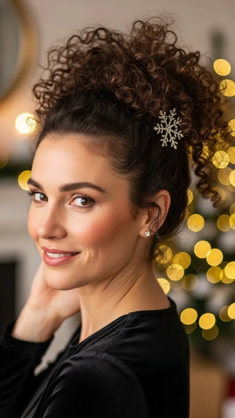 A curly high ponytail looks playful and polished at the same time. Flip your hair upside down to gather curls smoothly. Use a strong elastic so the pony sits high. Let the curls fall naturally. Add a sparkly clip or small gemstone pin at the base for that holiday touch. If your curls dry out fast, mist water and scrunch in a little cream before styling. You can also wrap a curl around the elastic to hide it. For more volume, pull gently at the ponytail base. This is a low-cost style that still feels party-ready.