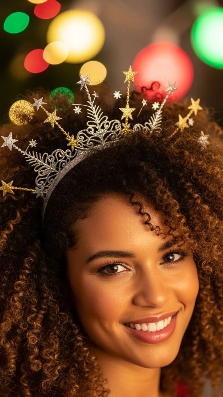 A curly afro looks stunning with very little effort. Pick your curls gently to add fullness. Slide on a holiday headband to frame your face. Choose thin metallic styles if you want something subtle. For more softness, apply a little leave-in conditioner and stretch curls with your hands. This style is affordable because it uses pieces you already own. If your curls shrink overnight, stretch them lightly with a banding method before styling. It takes only minutes to look party-ready.
