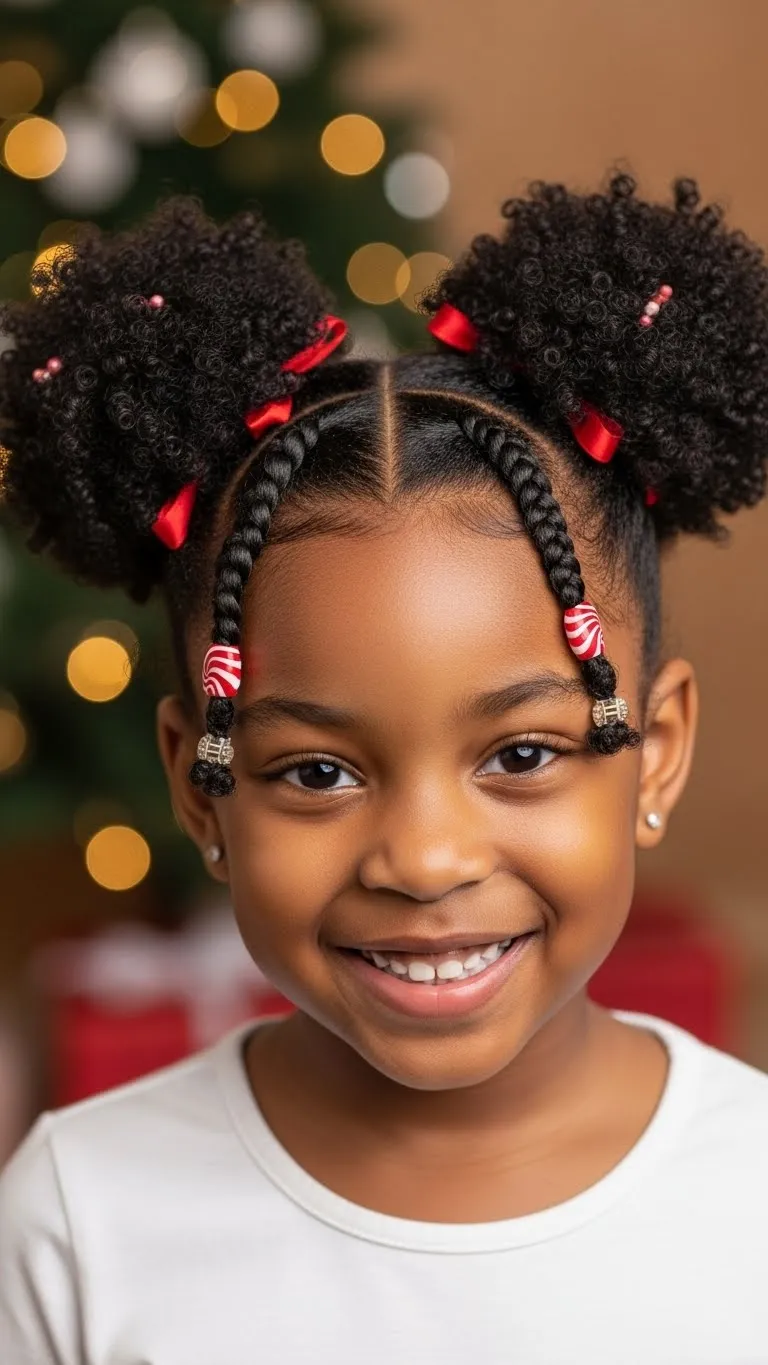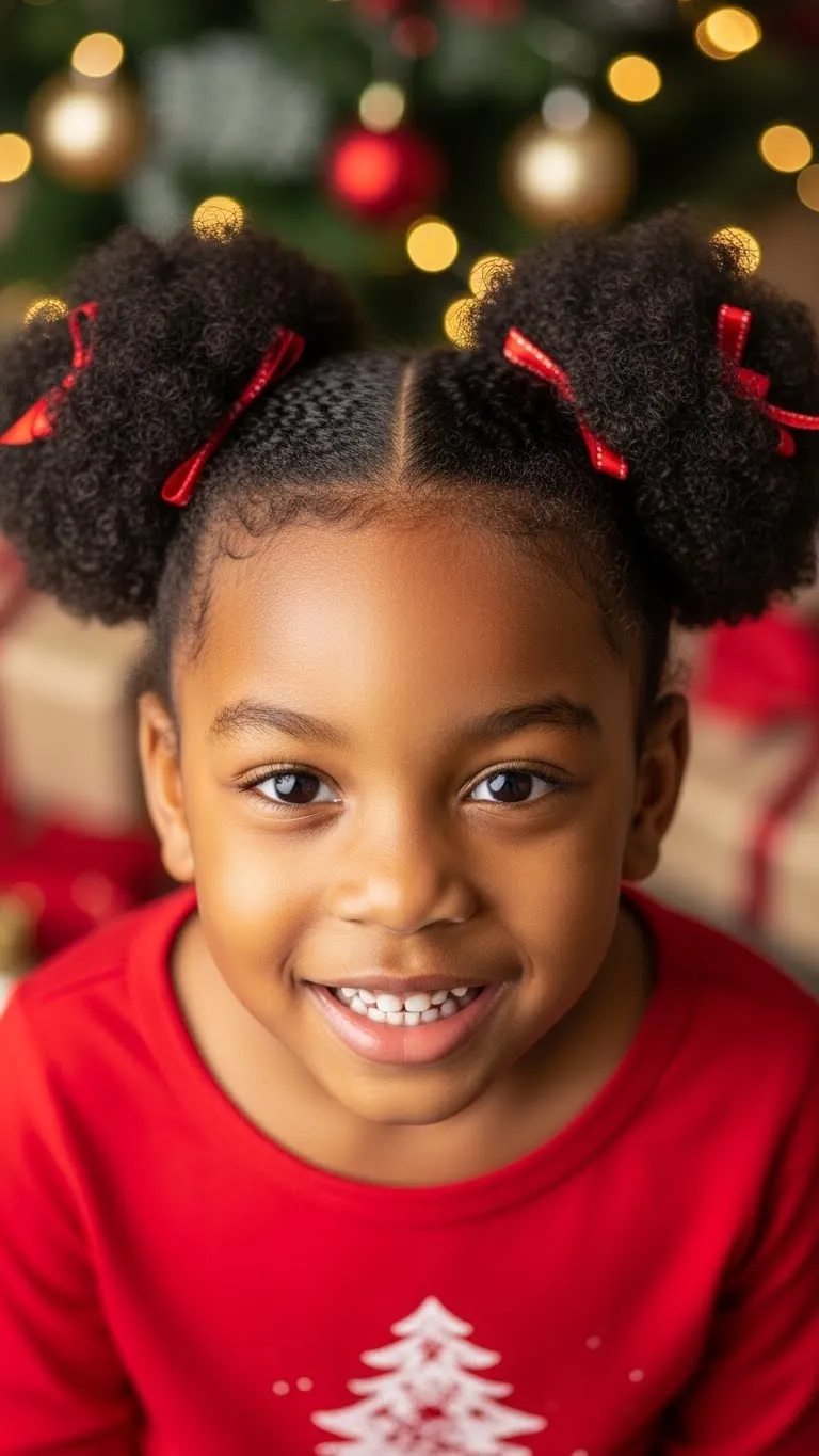 Create two fluffy puffs that sit high and round. This style works well on stretched or blown-out hair because it gives a fuller shape. Use a little moisturizer to keep the hair soft. Tie each puff with red ribbons to add a holiday look. You can even add light gold clips for a fun sparkle. This takes less than ten minutes and stays neat all day. For kids with thick hair, use a soft-hold gel only around the edges. Avoid pulling the bands too tight. If your child is tender-headed, use snag-free stretch ties. This is a simple style for morning routines. It also photographs well for school pictures and family gatherings. Keep a small spray bottle with water and conditioner nearby to refresh the puffs later. If you want extra definition, twist each puff into four chunky twists the night before, then release them in the morning. The result is soft, fluffy hair with a light holiday feel.