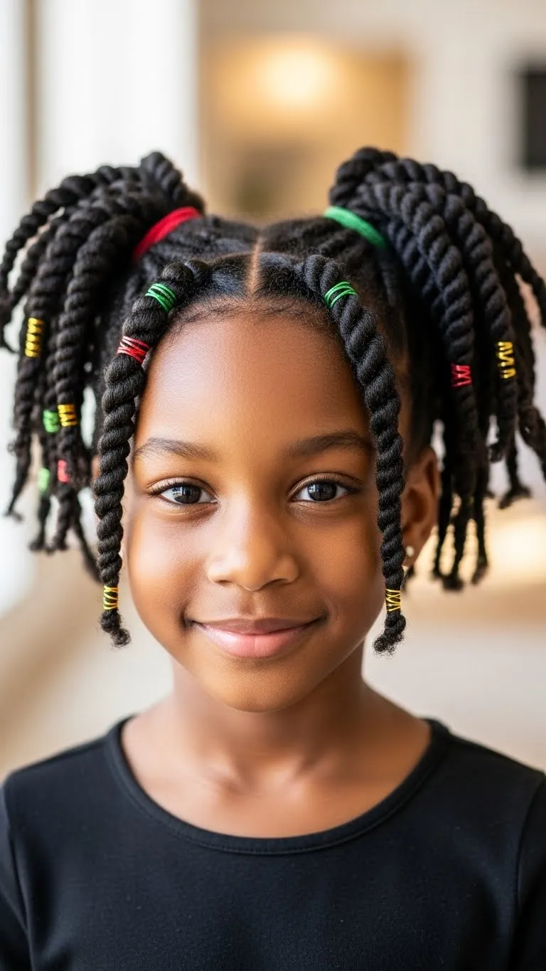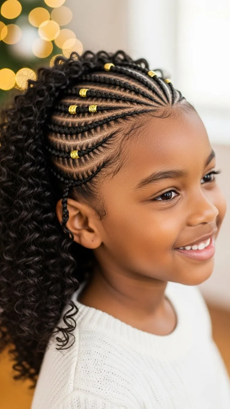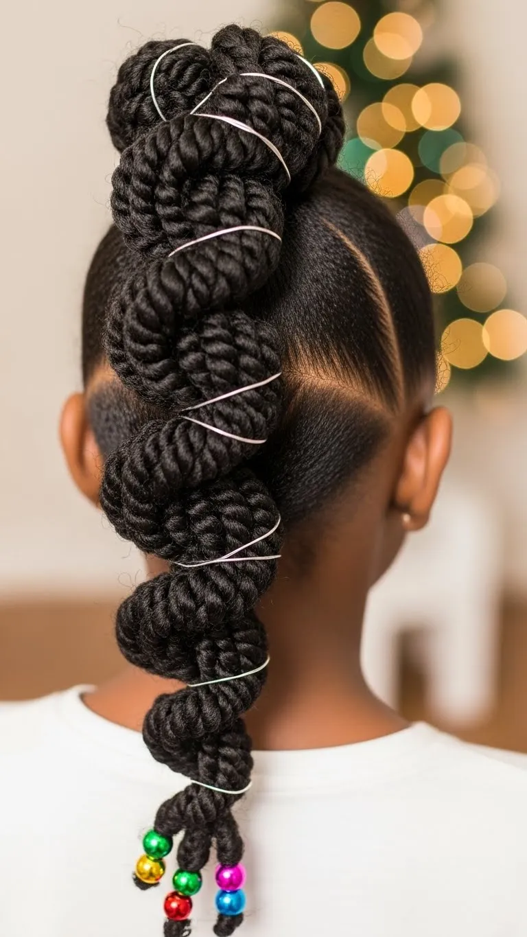 Mini twists are perfect for kids who like low-fuss styles. Start with moisturized hair, then create small square parts. Twist each section neatly and secure the ends with beads or bands. Once the twists are done, guide a few of them into a swirl pattern on top. Use tiny clips shaped like snowflakes or stars. This look lasts several days with gentle care. It works for playdates, parties, and school days. You don’t need expensive tools—just a rat-tail comb, a bit of twisting cream, and patience. To refresh, lightly oil the scalp and spray the twists with water. If your child sleeps wild, wrap the twists in a soft bonnet at night. You can also gather the twists into a ponytail the next day for a second style. The swirl design adds a cute holiday touch without extra work. Kids who dislike heavy styles will enjoy how light this one feels.