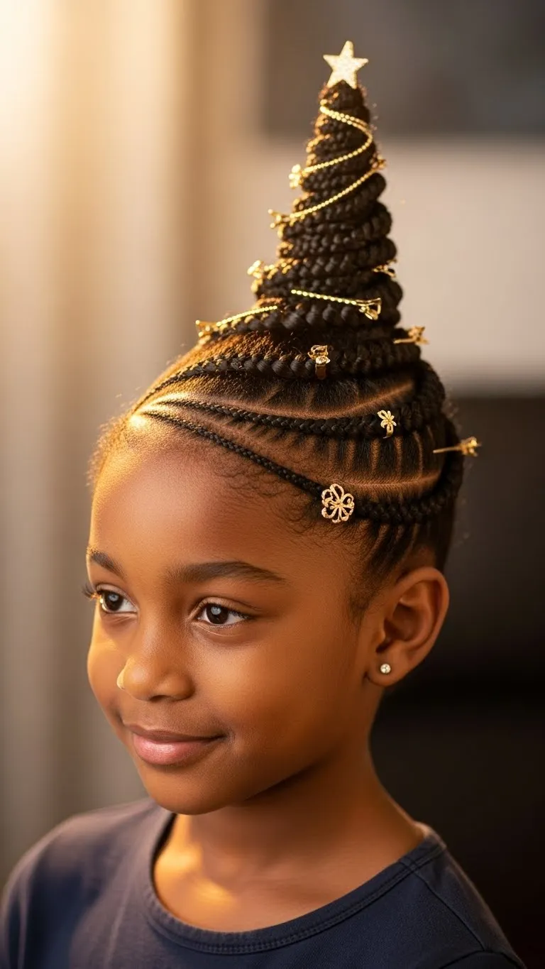 Part a small triangle section at the top of the head. Braid it downward. While braiding, pull small sections outward to widen the shape so it resembles a tree. Add small gold clips or beads along the braid. This creates a playful holiday design. Leave the rest of the hair in a puff or curls. You only need a comb and a few accessories. This style takes under fifteen minutes. It’s great for school holiday events. Kids enjoy the themed look. Keep the braid neat with a little gel at the base. You can also create two small tree braids for a different version. Budget-friendly accessories make this style affordable.