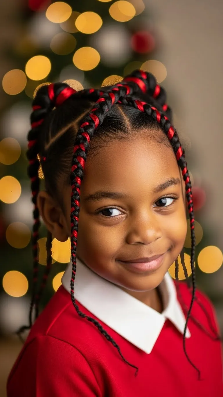 A loose halo braid gives a sweet, gentle look. Part the hair near the ear and braid around the head. Keep the braid soft so it doesn’t feel tight. Secure the ends with a small band and tuck them under the braid. Add a few beads or clips for a holiday feel. This style is great for kids who move around a lot because it stays in place. Use a little leave-in conditioner to help the braid glide. If your child’s hair is shorter, create two large cornrows and pin them to form a circle. You don’t need fancy tools—just bobby pins and a comb. This style lasts through long days without much fuss. Add a bit of light oil for shine before heading out. It’s also a cute choice for Christmas parties or church events.