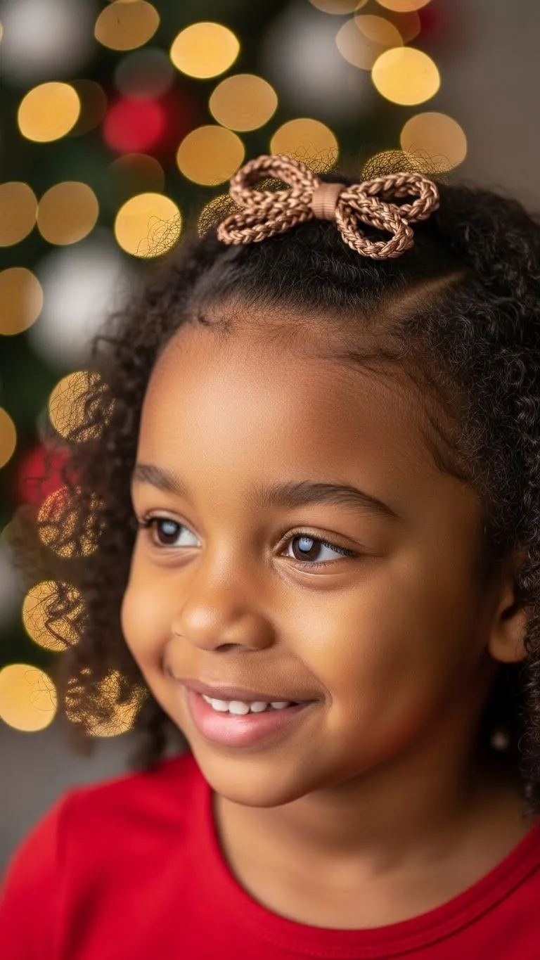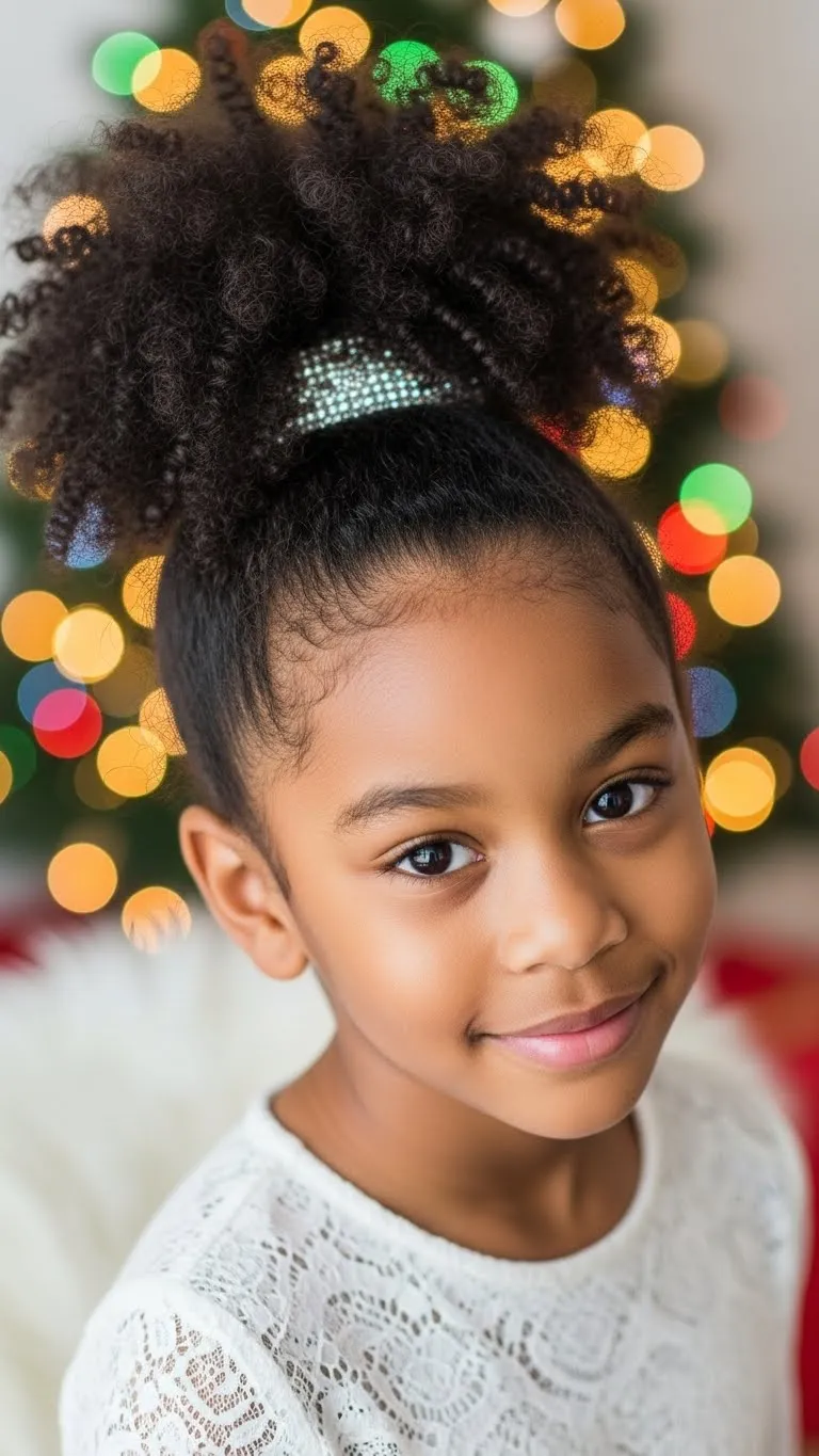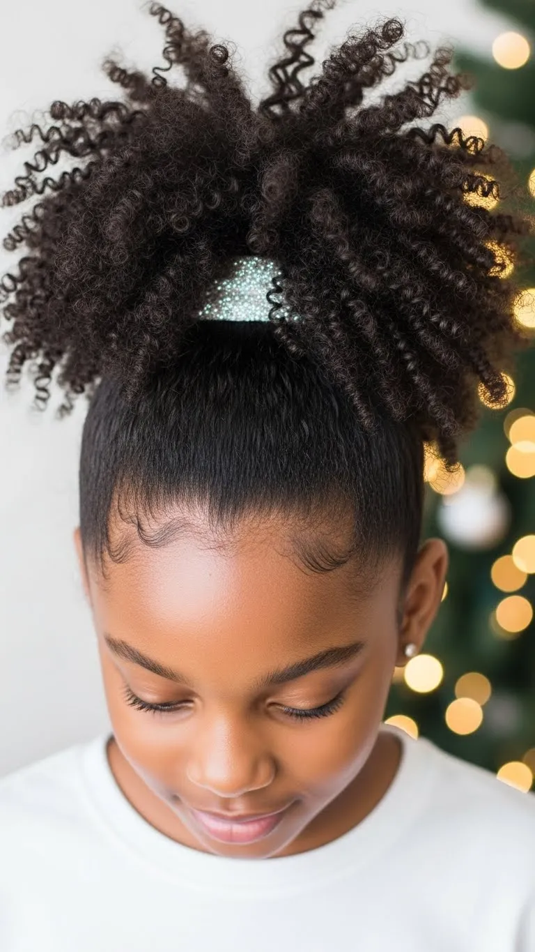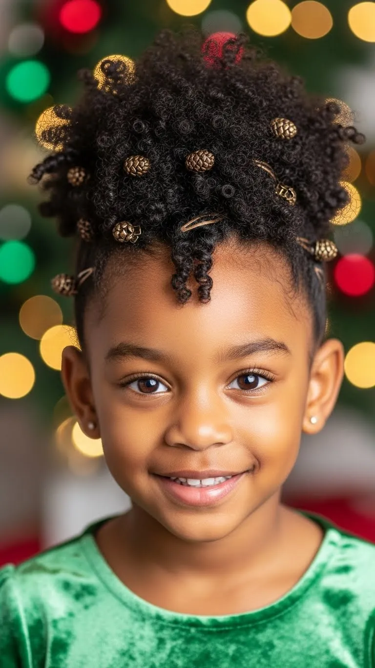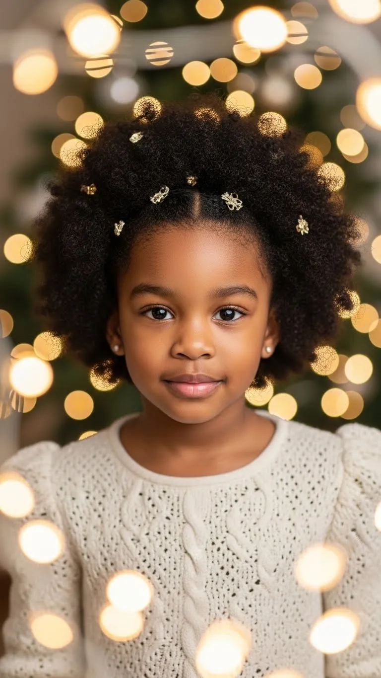 This style celebrates natural texture. Pick the hair gently into a round cloud shape. Work in small sections to avoid tangles. Add tiny gold clips or stars around the afro for a soft holiday sparkle. Use a moisturizing cream to keep the curls plump. If your child has very coily hair, band it at night to stretch it slightly. This helps the cloud shape form easily in the morning. This look is great for kids who don’t enjoy tight styles. Keep a spray bottle handy for quick touch-ups during the day. The afro stays cute even when it gets a bit frizzy. It brings out personality and looks amazing in photos. Budget-friendly accessories from dollar stores work well here. You can also trim flyaway ends if needed. This is a perfect option if you want something natural, fast, and festive.