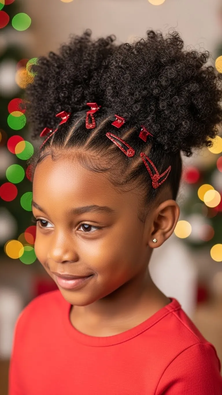 Make two puffs—one near the top and one slightly behind it. This gives a double halo effect. Pick the curls gently for volume. Add holiday-colored clips around each puff. This is a soft style for kids who like natural curls. Use a bit of curl cream for definition. Keep the base smooth with a soft brush. This style works on medium-length hair. It’s quick to refresh during the day with a little water.