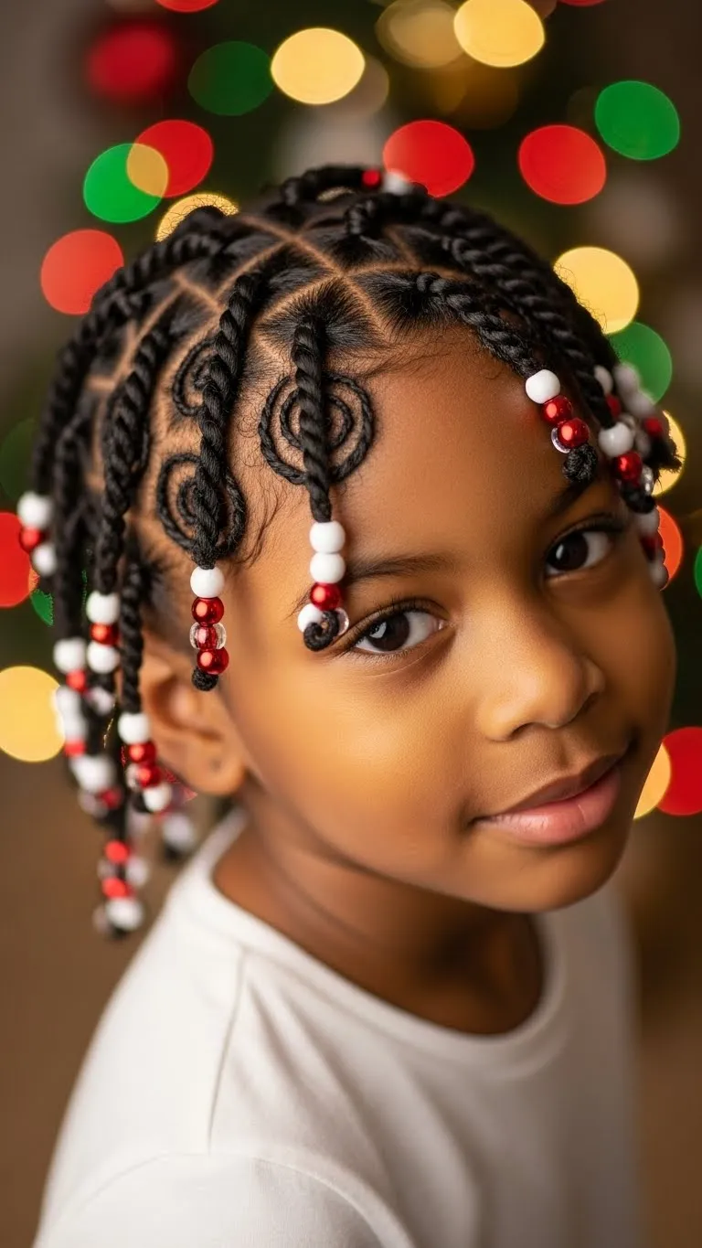 Section the hair into small squares. Create ponytails on each one. Add colorful beads to the ends. This gives a bright, cheerful holiday feel. The style is easy for parents and fun for kids. You can mix bead colors to match outfits. Use soft bands to avoid tension. This look stays in place through school activities. It’s also affordable since beads come in large packs. Refresh the style with light oil on the scalp.