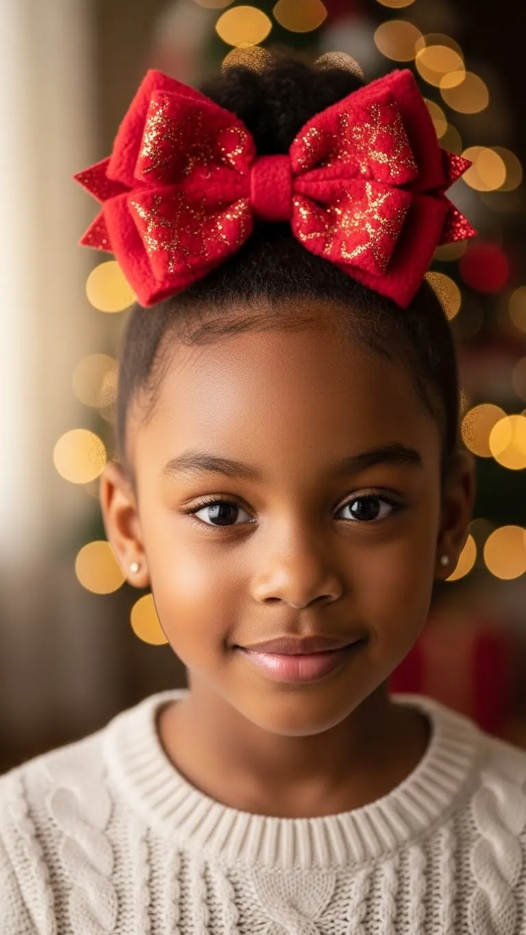 Create a medium-high bun. Keep it loose and soft. Place a large holiday bow on top. Secure it with a clip. This style works for all ages. Great for family pictures and school parties. It takes less than five minutes. Use a little moisturizer around the edges. You can switch bow colors throughout the week. This is a budget-friendly and cheerful style.