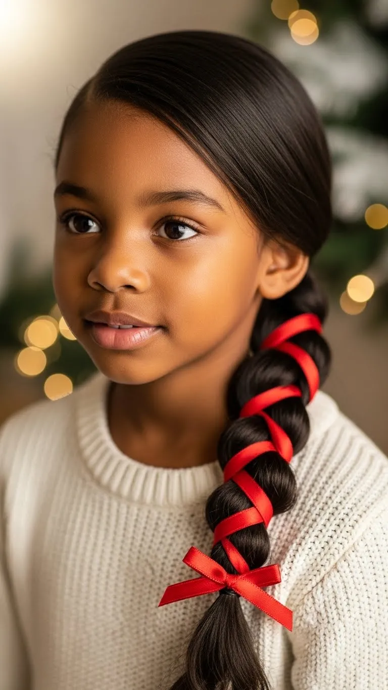 Make three plaits along the front hairline. Wrap each plait with red-and-white ribbon. Tie off the ends with a small bow. Leave the rest of the hair curly or stretched. This style is festive and lightweight. It takes under ten minutes. Perfect for Christmas morning pictures. You can reuse ribbon from holiday decorations. Smooth the front with light gel. Kids enjoy the fun ribbon patterns.