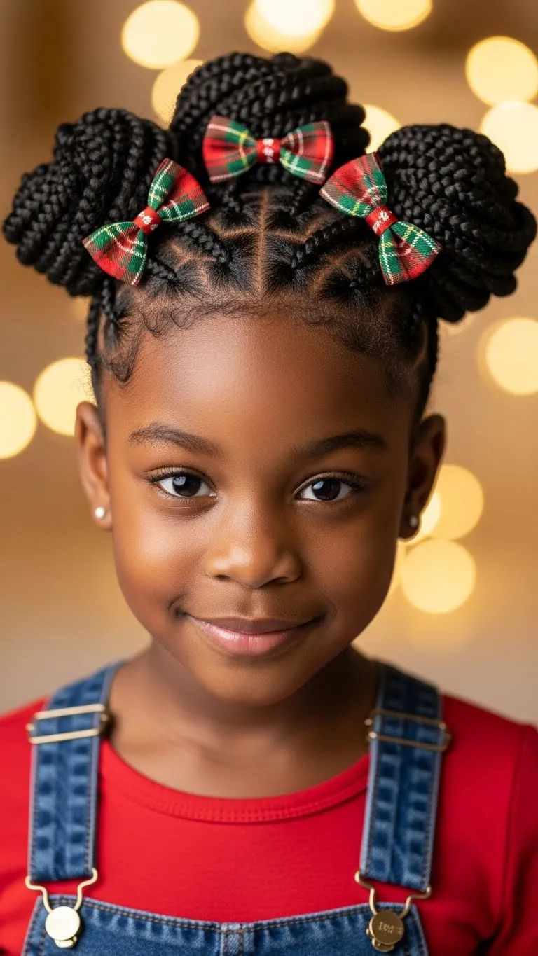 Part the hair into four square sections. Braid each section loosely, then twist them into buns. Secure with bands that won’t snag. Add tiny bows for holiday charm. This is a protective style that lasts several days. You can refresh the edges with a little gel each morning. If your child has thick hair, stretch it the night before using braids or bands. This helps the buns form easily. Dollar store bows or clips work perfectly for decorating. Kids like that the style feels light and playful. You can also turn the buns into mini space buns by wrapping the braids around themselves. Keep the scalp hydrated with a little oil every few days. This style stays neat even after a bit of playtime.
