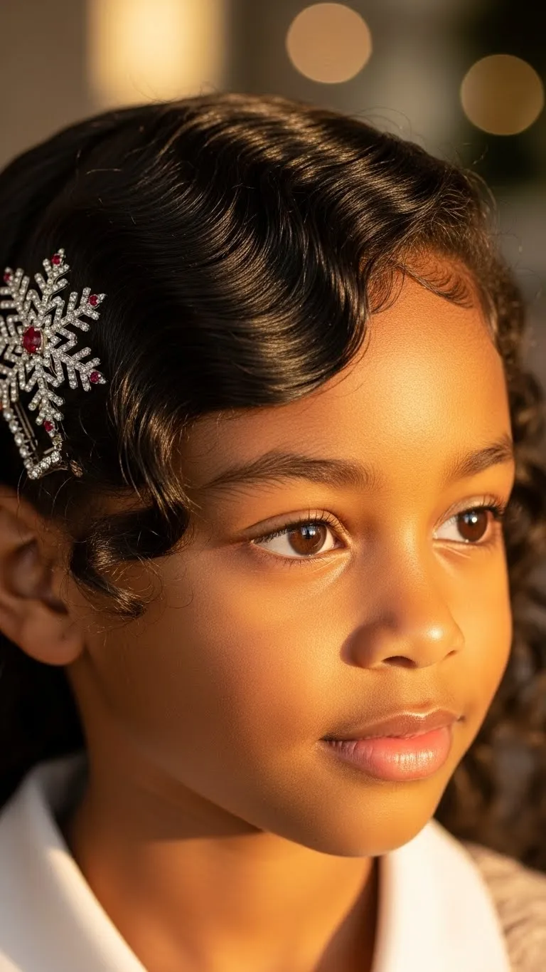 For kids with curly hair, this is simple and cute. Start by applying a curl cream to define the curls. Use your fingers to guide the hair to one side. Secure it with a sparkling or glittery holiday clip. The rest of the curls should fall naturally. If you want extra volume, fluff the roots gently. This takes minimal time and works for busy mornings. You can refresh the curls with a light mist of water. If your child dislikes stiff products, stick to light creams. This style is perfect for Christmas pictures or a casual outfit. Switch the clip color to match different clothing. Kids love the soft, loose movement. It’s a nice option when you want something simple that still looks special.