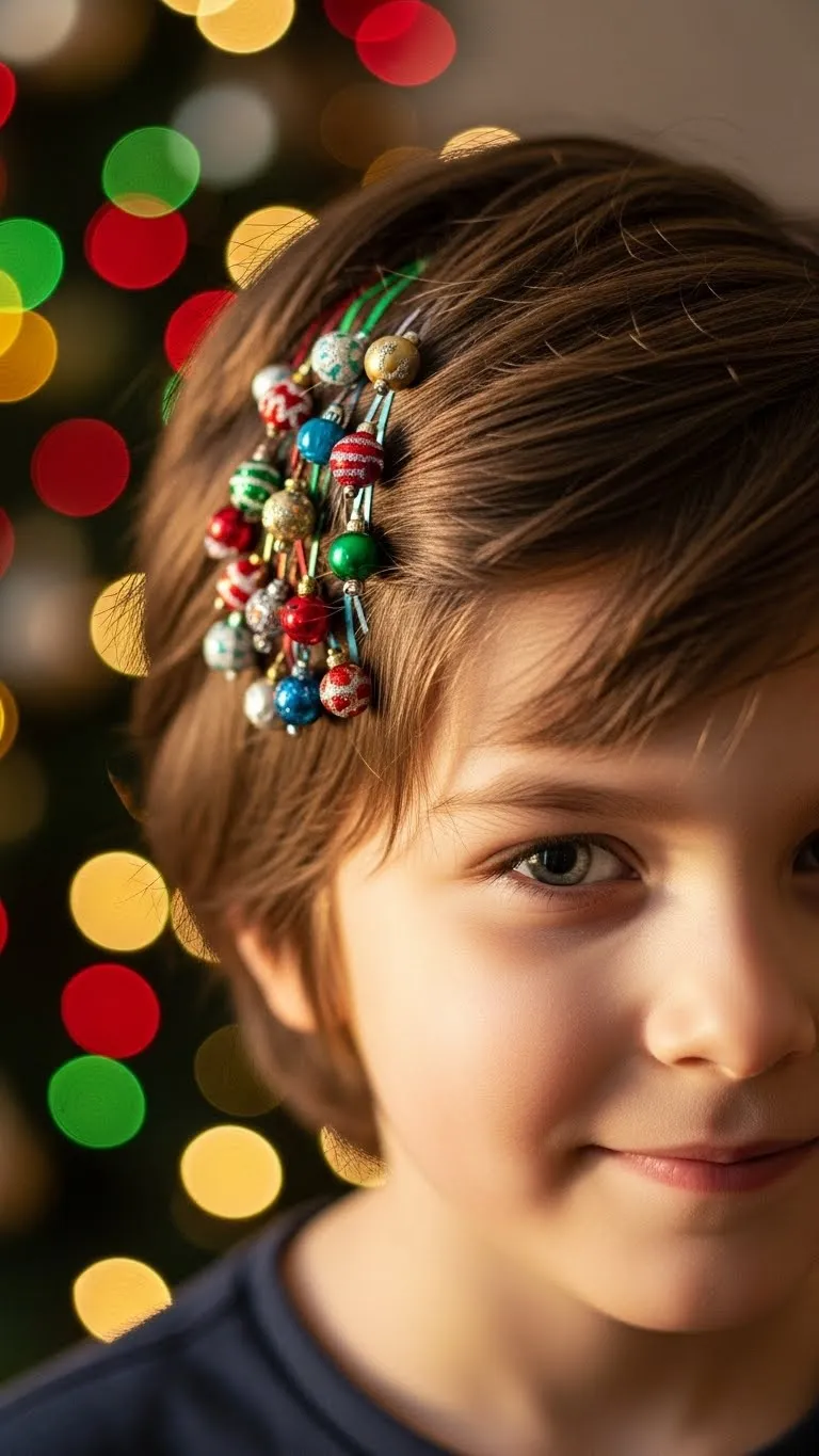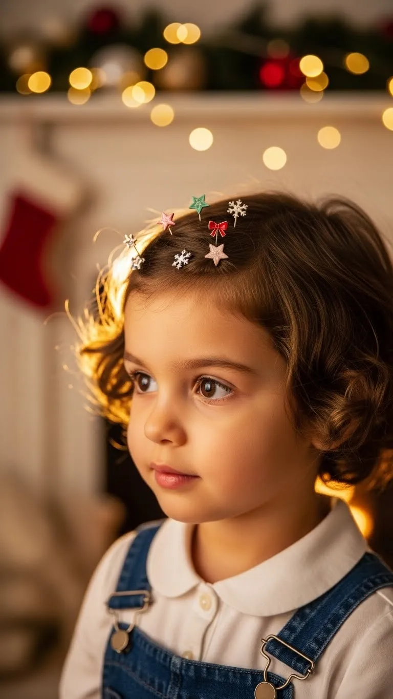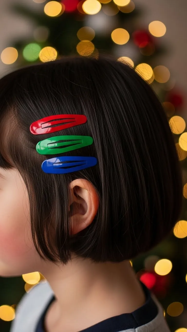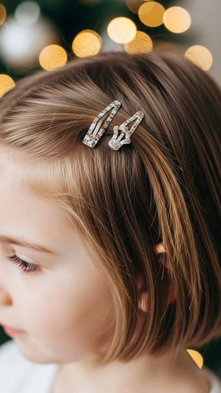 Criss-cross clips work well on any short style. Part a small section at the front and clip two barrettes in an X shape. Choose bright holiday shades like gold or red. This takes seconds but looks intentional and cute. Kids love picking clip colors, making the process fun. If hair is fine, use grip clips lined with fabric. You can find affordable multipacks at discount stores. Rotate clip placement each day to keep things interesting.