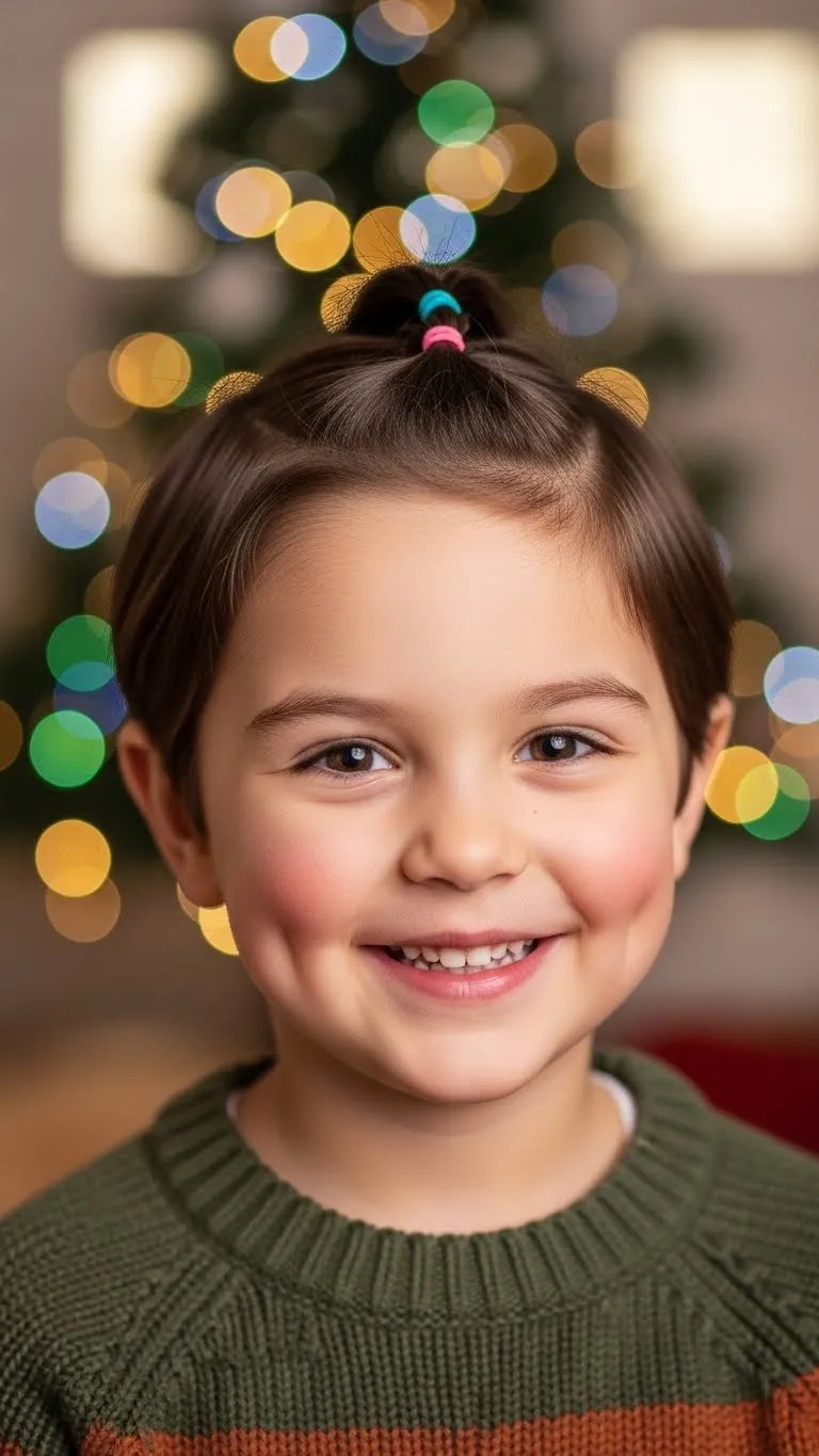 A mini side puff works well for very short cuts because you only gather a small section. Brush the front part toward one side. Use a soft elastic or tiny clip to hold it. Pick a red or green clip for a festive touch. Try one with a small star or bell charm for added sparkle. This style stays in place during active play and takes less than a minute to do. If the hair is slippery, lightly mist it with water before shaping the puff. Parents love this trick because it gives a neat look with almost zero supplies. You can also switch the clip color depending on outfits. This small detail makes holiday photos look coordinated but still natural. Most dollar stores carry packs of seasonal clips, so you can collect a few without spending much. Have your child pick their favorite clip each morning to make them feel involved.