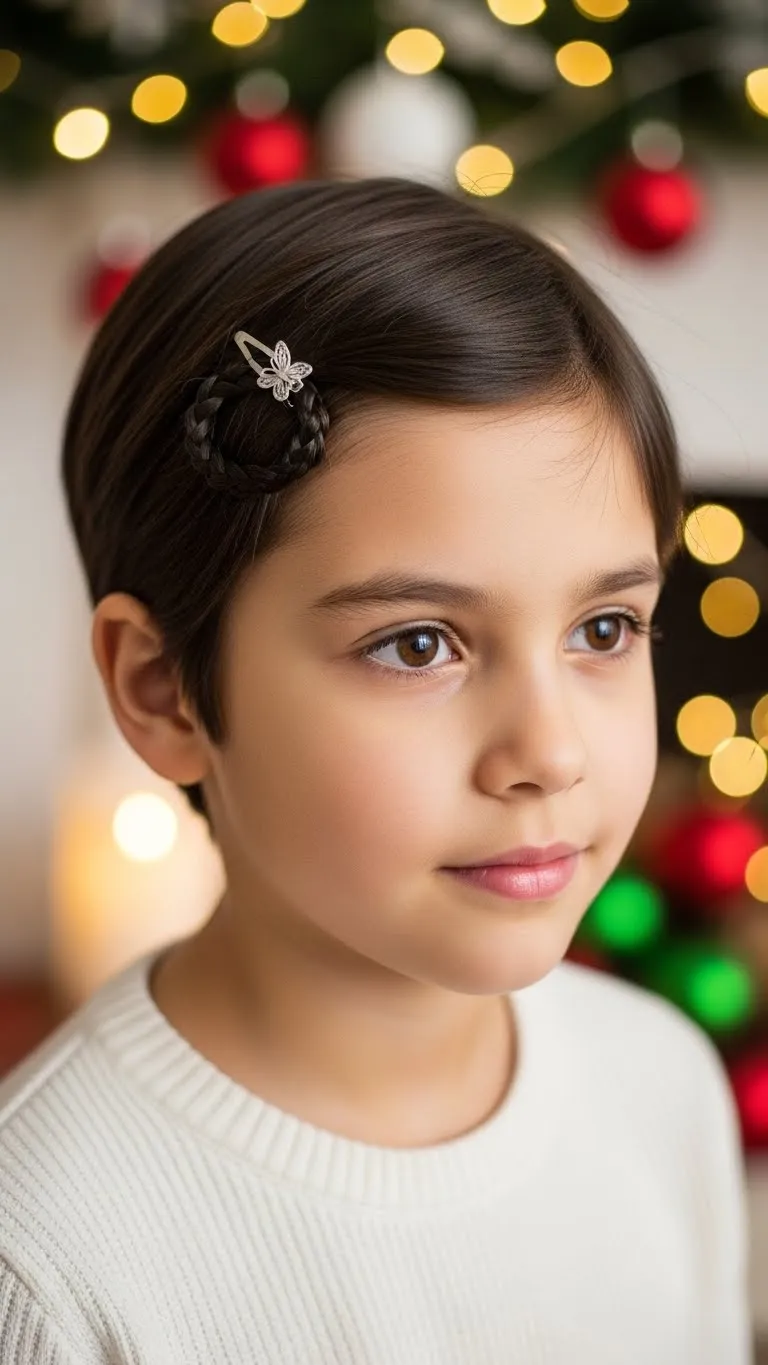 Short hair can still hold a small braid loop. Make a tiny braid near the temple, then fold it upward and clip. Add a bow clip for a holiday twist. This takes about a minute and adds cute texture. If the braid slips, twist the hair a bit before braiding. Kids enjoy choosing the clip colors to match outfits.