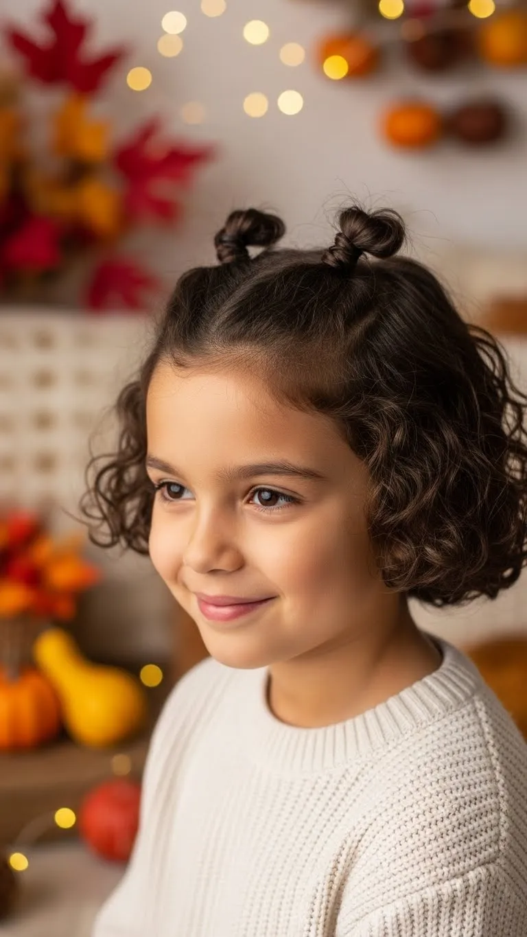 Double puffs work great even on short hair because you only need small sections. Part the top into two sections and secure each with elastics. Add bows or mini clips for color. This style looks playful and works well for active kids. It’s easy to redo if one puff loosens. Use soft elastics to avoid pulling. You can match puff colors with outfits using inexpensive ribbon scraps.