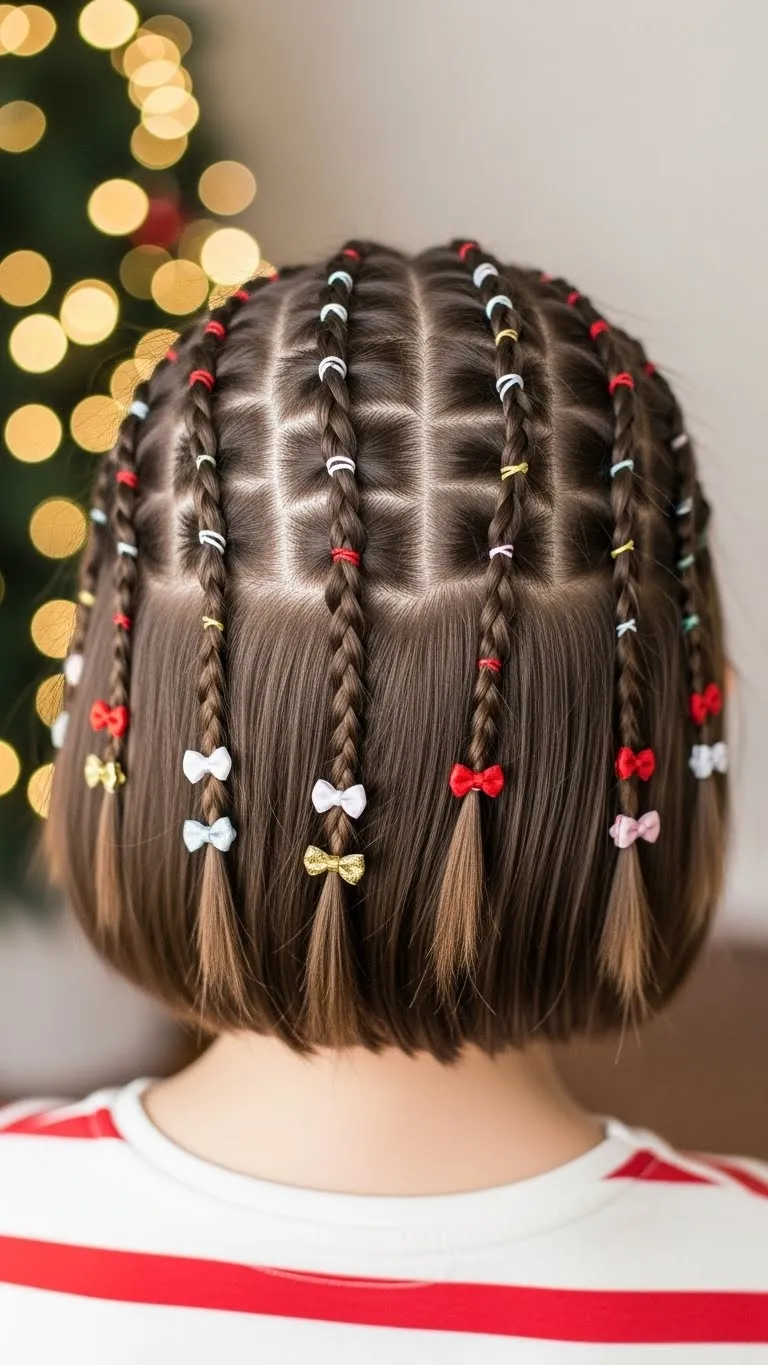 Baby braids need very little length. Part two thin sections at the front and braid downward. Secure with small elastics. Add festive color by choosing holiday shades. Baby braids stay neat even after running around. If braids slip, dampen the hair slightly before styling. This is a great way to manage uneven lengths and still look polished.