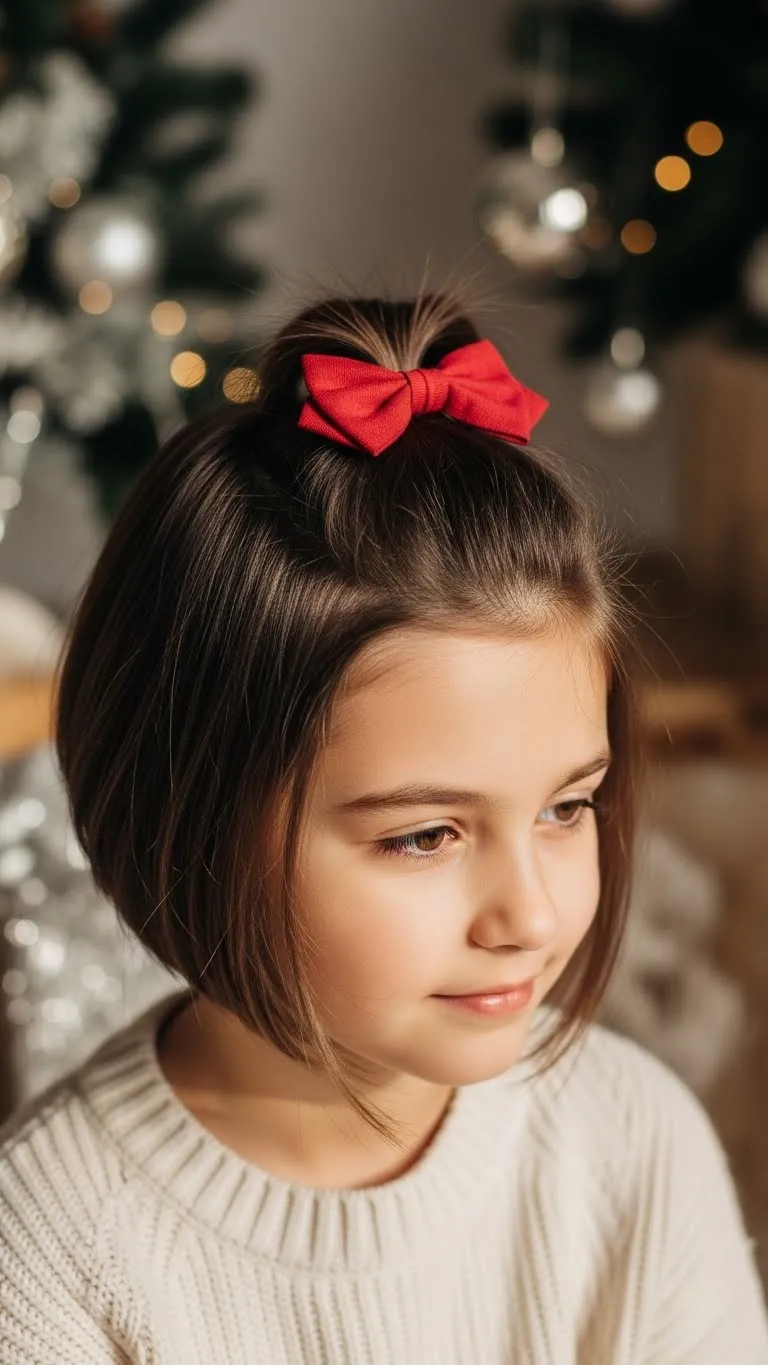 A half-up bow tie works even on chin-length cuts. Gather the top section of hair and secure with an elastic. Add a small ribbon bow right above it. Choose velvet or satin for a holiday look. This quick style adds instant sweetness without much effort. If hair slips through the elastic, use a silicone mini band for better grip. It’s a great way to highlight curls or natural waves too. Parents often use leftover gift ribbon for the bow, keeping the style budget-friendly. You can change bow colors to match dresses or sweaters. This is also a smart option when you’re in a rush but still want something that looks intentional.