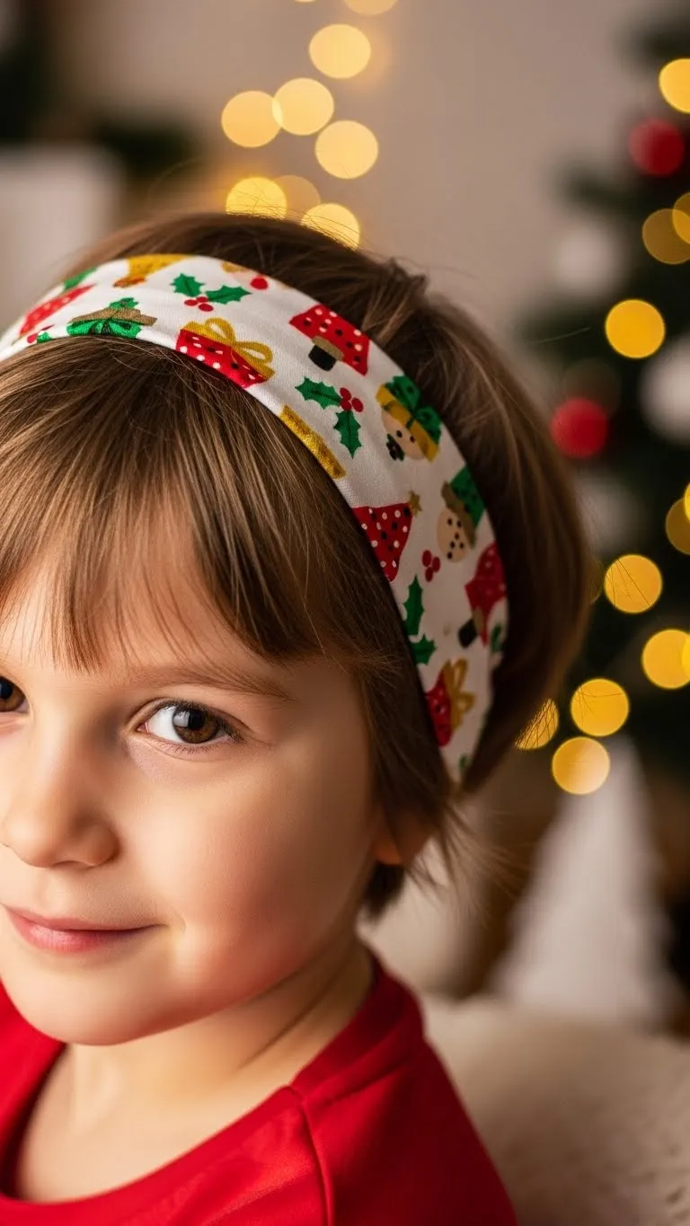A wrapped headband is an instant fix on busy mornings. Choose a fabric headband that feels soft and stretchy. Slide it over the forehead and push it gently back into place. It keeps hair off the face and adds color without needing clips or elastics. Headbands come in holiday prints at most low-cost stores, making this style accessible. Try knot-style bands for extra texture. If your child dislikes tight bands, pick one with a wide, gentle fit. You can also fold a small scarf into a strip and use it as a DIY headband. This style works for straight, curly, or wavy short hair. It photographs nicely because the band adds contrast against the hair.