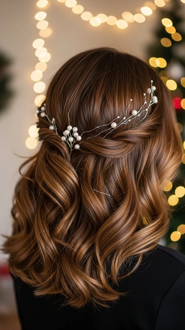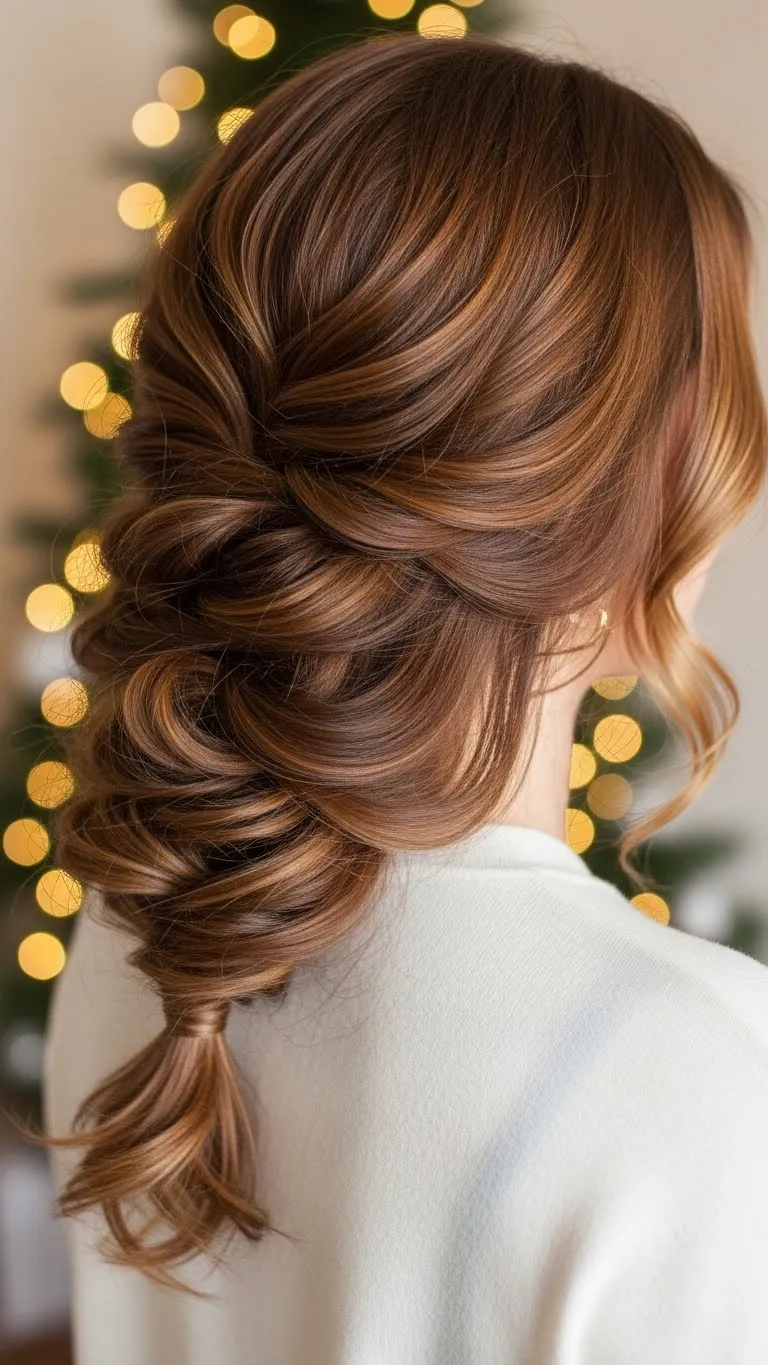Gather the top layer, twist it back, and secure with two crossed pins. Let the lower section fall naturally. Add soft waves for warmth. A gold or silver clip at the twist adds festive shine. Dry shampoo gives grip if your hair slips. This style is comfy for long gatherings.
