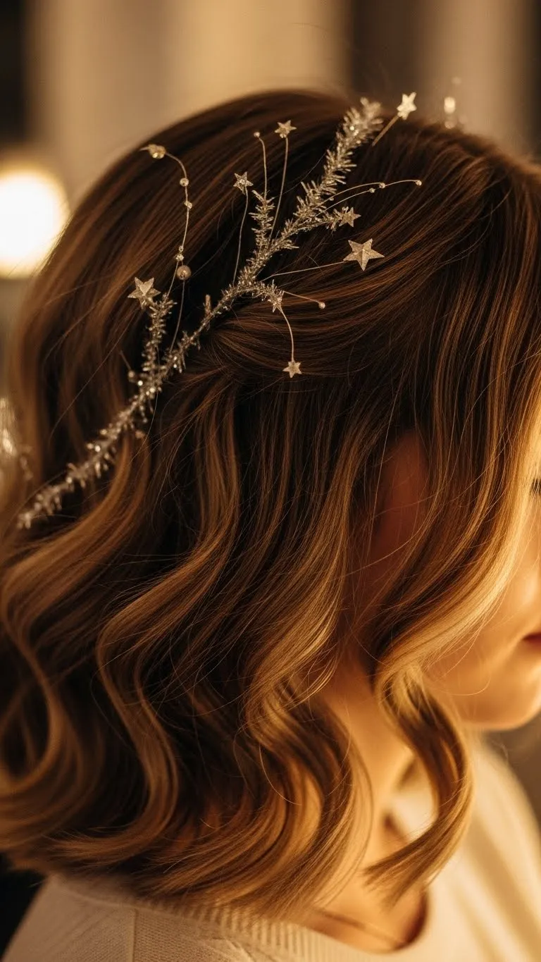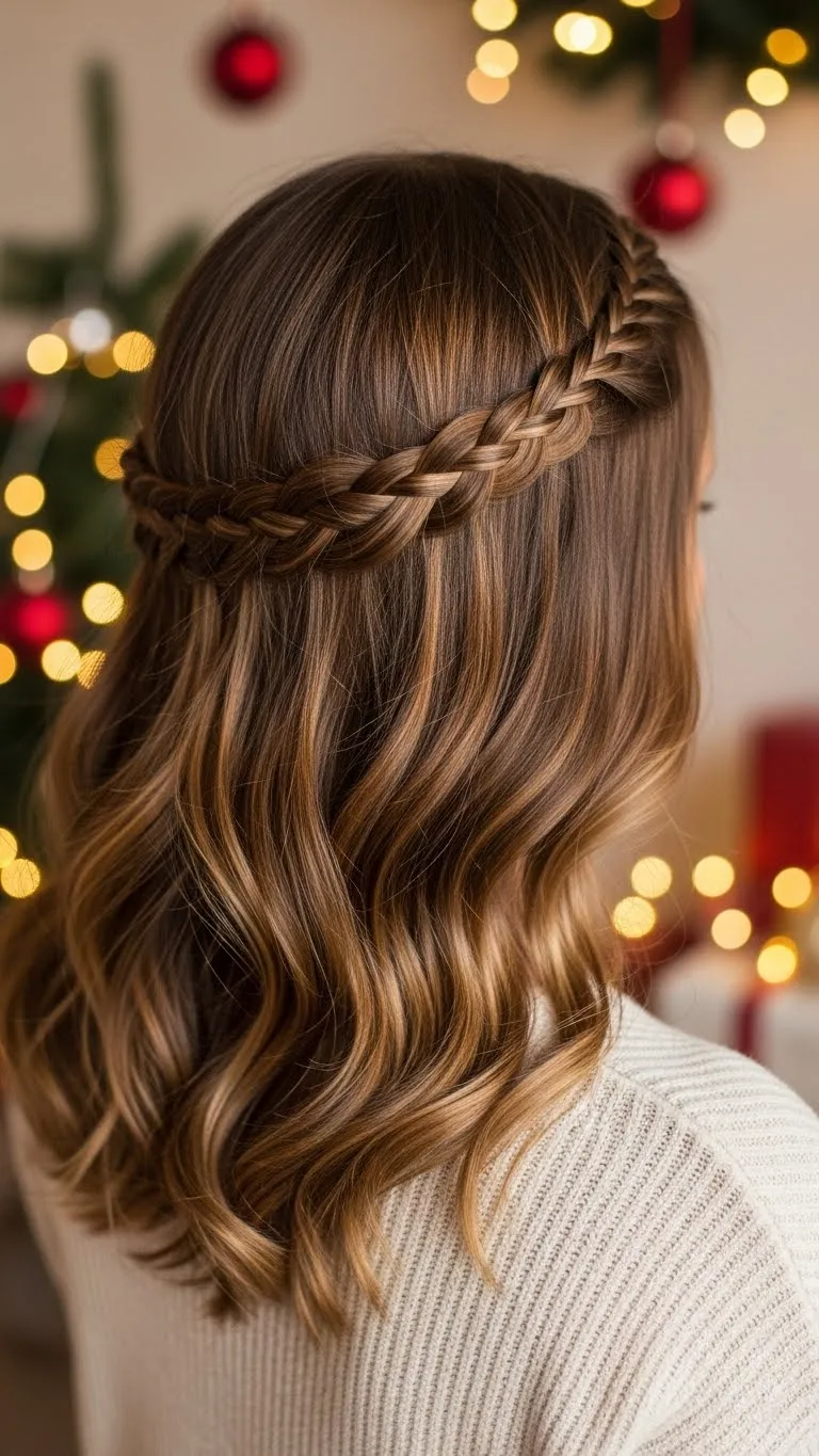 A tiny braid placed like a crown adds romantic charm. Take a small section behind one ear, braid it, and bring it across your head. Pin it neatly on the opposite side. Add a little wave or keep the rest natural. If your braid slips, add dry shampoo for grip. A tiny festive pin at the end adds a gentle holiday touch. This small detail frames your face nicely and holds up throughout long evenings.