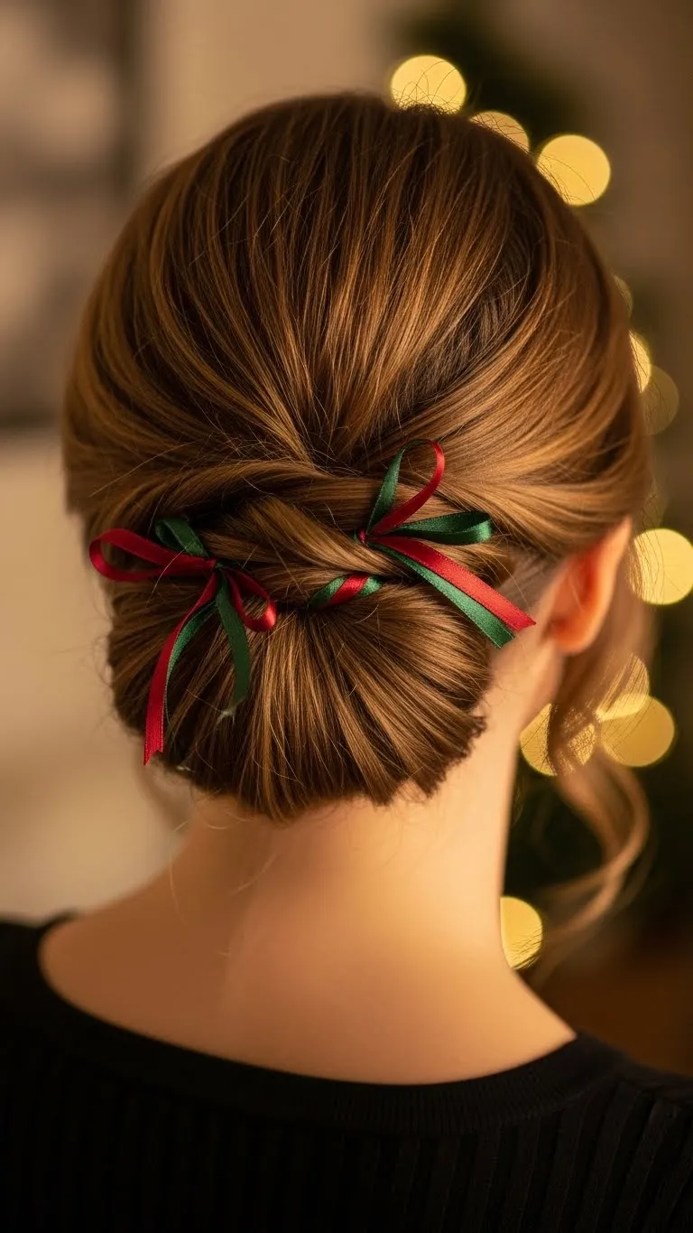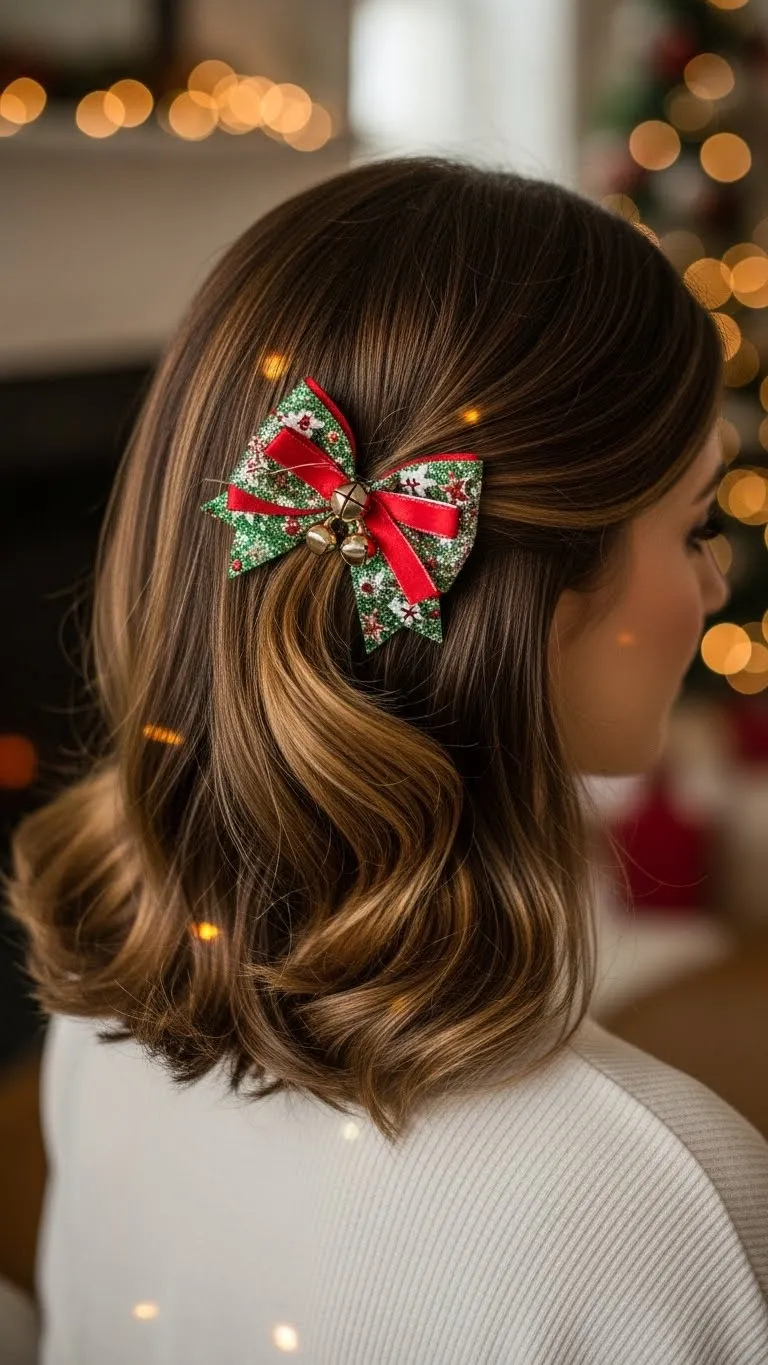 This half-up look adds simple charm. Twist two small front sections back and secure them with pins or a small elastic. Add a thin satin ribbon woven into the twists or tied at the back. Ribbons don’t have to look perfect—slightly loose ones feel sweet and playful. If your hair slips, add a small burst of texture spray. You can keep the bottom straight or curled. Even with busy mornings, this style comes together quickly. It gives a soft holiday vibe without effort and photographs nicely with minimal prep.