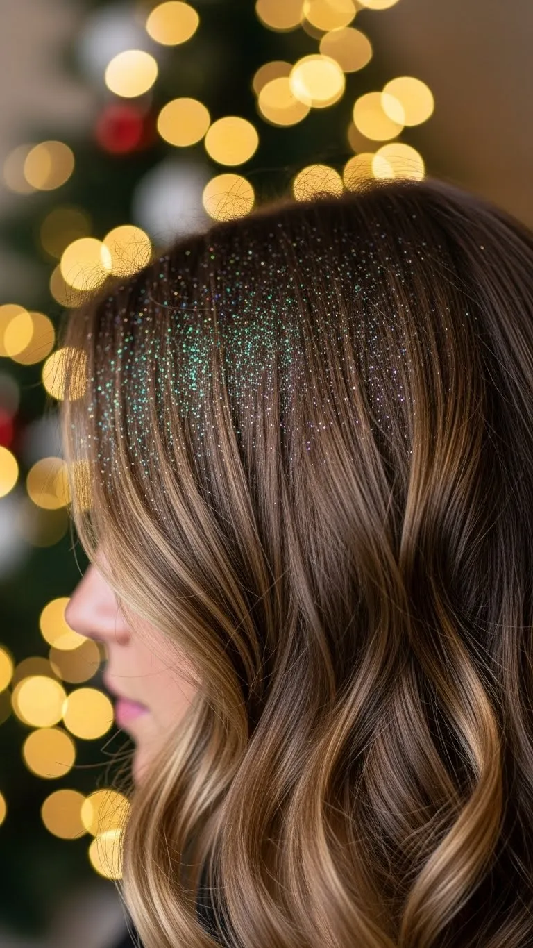 Create loose waves for gentle bounce. Then use a small brush to apply a tiny line of hair-safe glitter along your part. You need only a small amount. It catches the light beautifully in photos. Smooth the ends lightly if they puff out. The glitter adds holiday fun without being too bold.