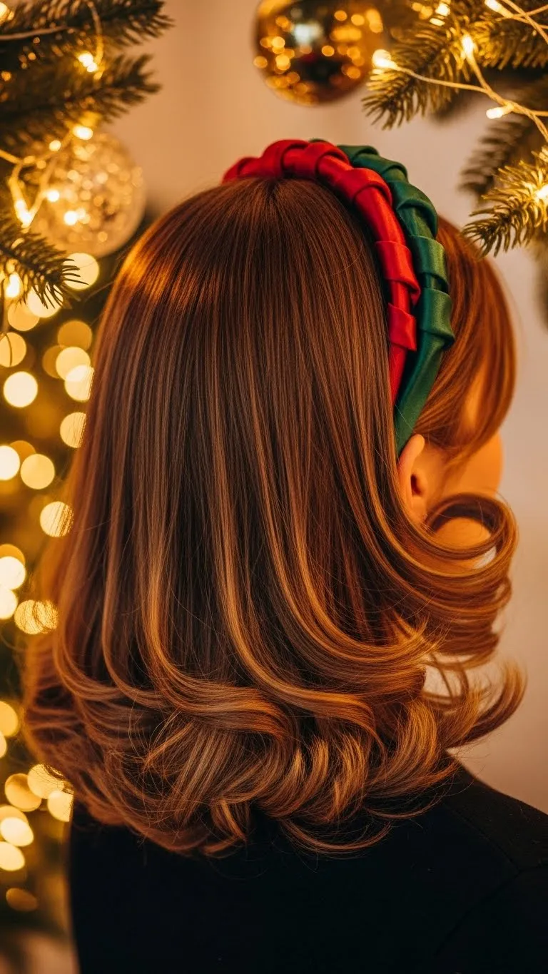 Straighten your hair and flip the ends outward for a playful look. Add a satin headband in red, gold, or green. This is one of the quickest holiday-ready styles. If the flip feels uneven, gently redo the ends. Headbands are cheap and instantly festive.