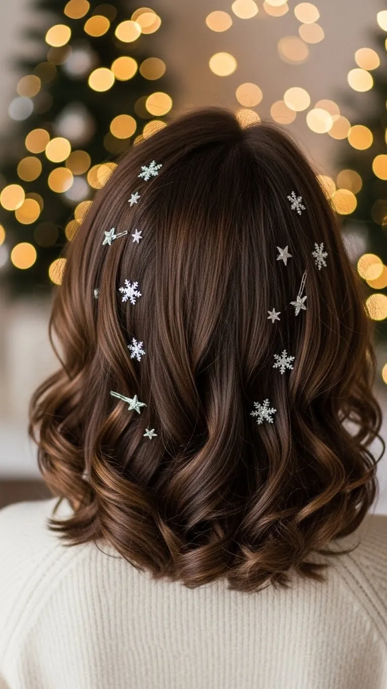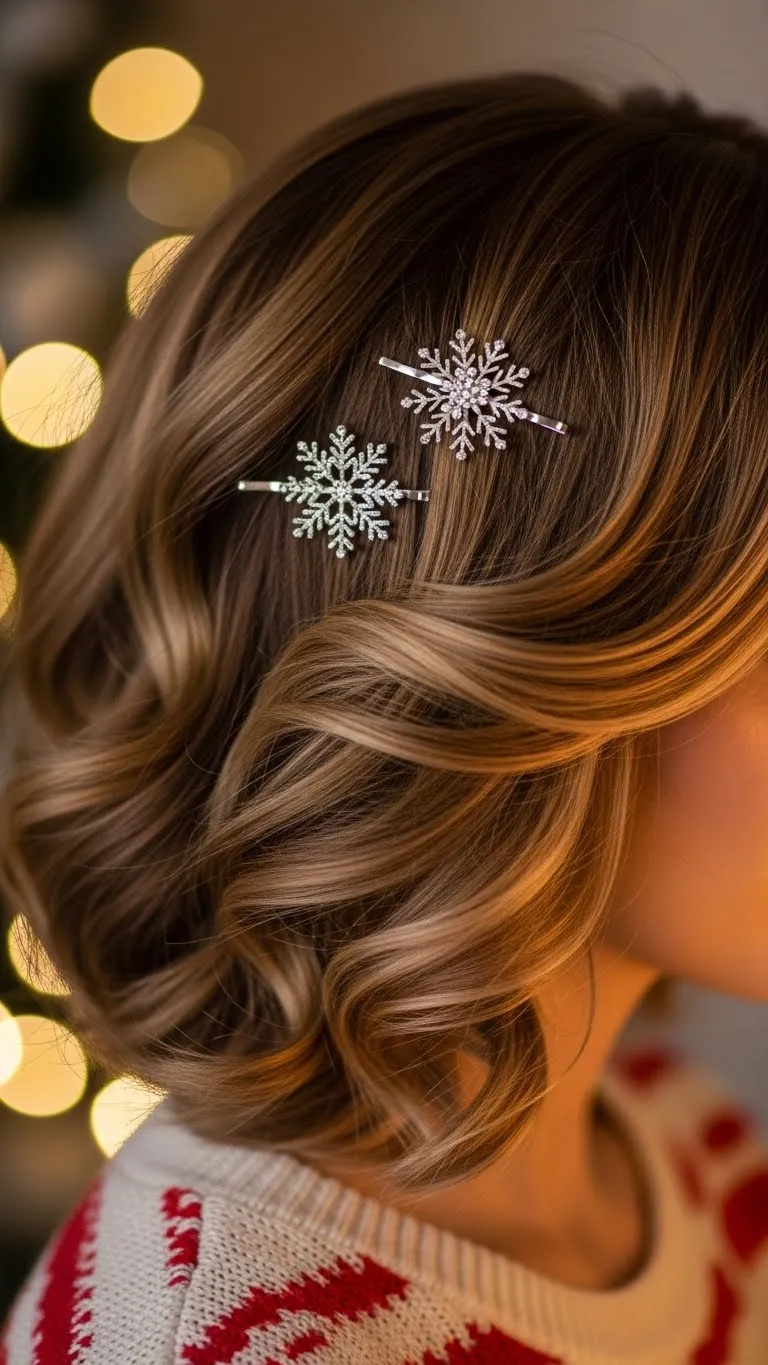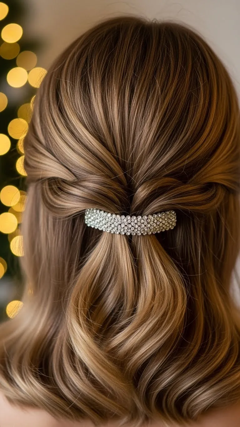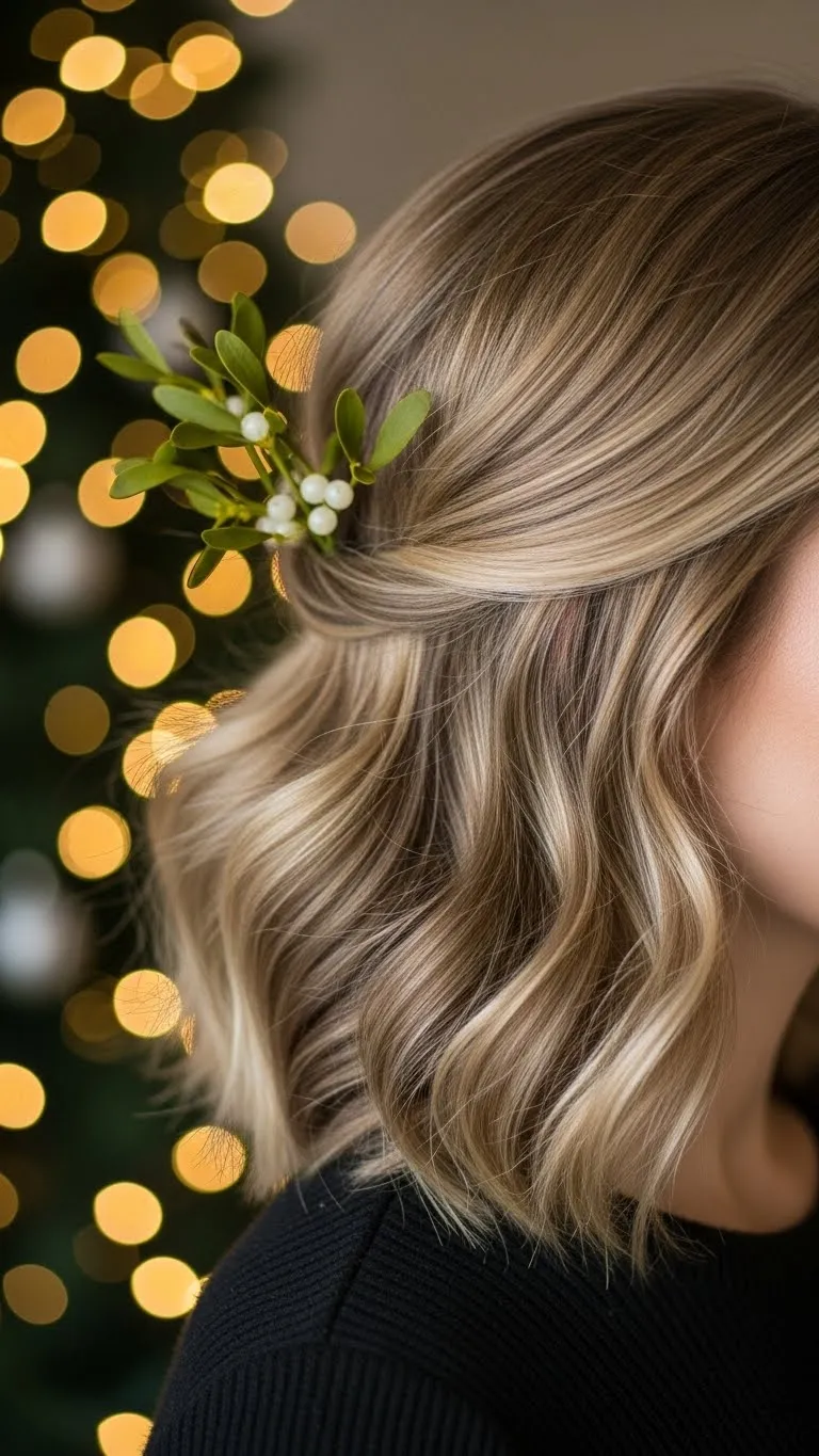 Take the top half of your hair and twist it into a relaxed bun. Pin it casually. Add a few sparkle pins around the bun for a festive finish. This style doesn’t require perfect waves—slightly messy hair works best. Flip your hair and spritz dry shampoo for quick lift. It’s a comfy everyday holiday look that still feels fun.