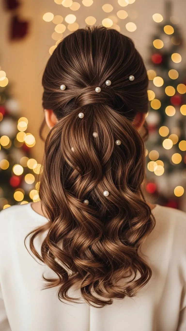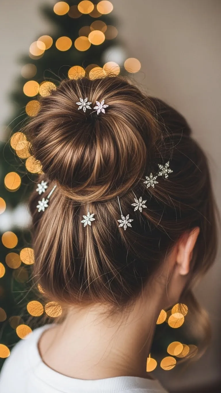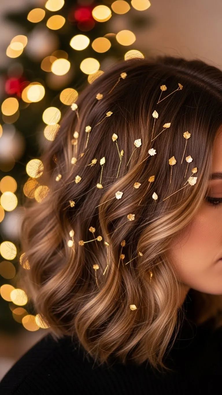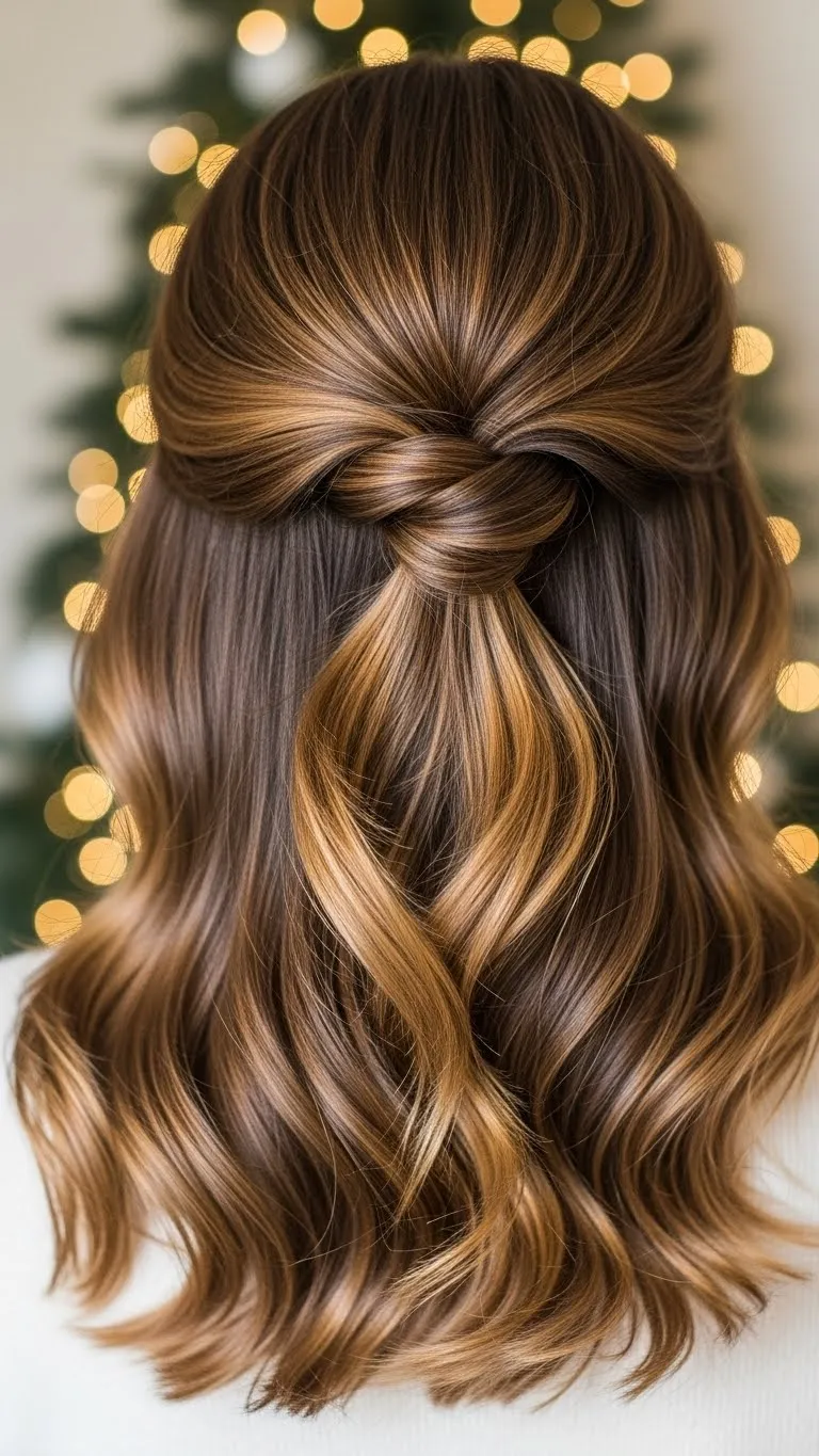 Take the top half of your hair and twist it into a relaxed bun. Pin it casually. Add a few sparkle pins around the bun for a festive finish. This style doesn’t require perfect waves—slightly messy hair works best. Flip your hair and spritz dry shampoo for quick lift. It’s a comfy everyday holiday look that still feels fun.