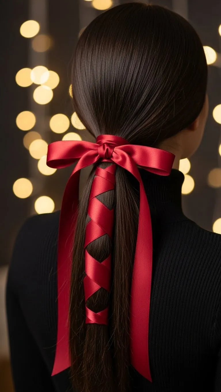 Tie a low ponytail and wrap satin ribbon around the base. Choose a festive color. Curl the ponytail lightly for shape. If you want more volume, add dry shampoo at the roots. Ribbons are cheap and instantly dress up a basic ponytail.
