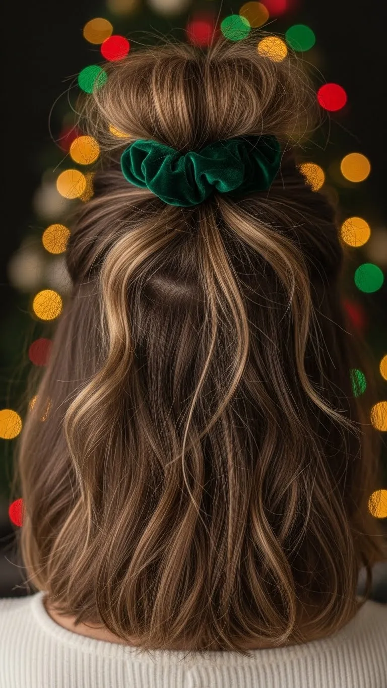 Curl random sections lightly to create messy waves. Gather the top section and secure with a velvet scrunchie. Seasonal scrunchies are affordable and soft. If your waves get frizzy, smooth the ends gently. It’s a comfy style that fits casual holiday plans.