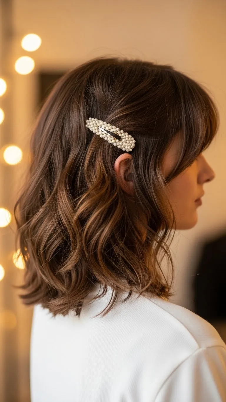 Sweep your hair to one side and secure it with a soft velvet or satin bow clip. Curl the ends lightly to add movement. Add a hidden pin underneath to keep everything from sliding. Bow clips are budget-friendly and add instant charm. This style frames your face nicely. It’s ideal for parties, dinners, or holiday photos.
