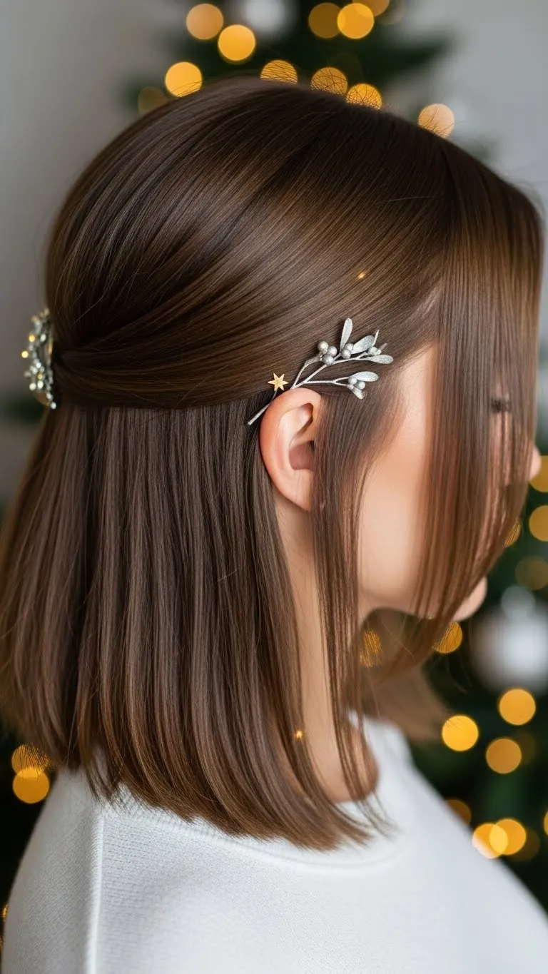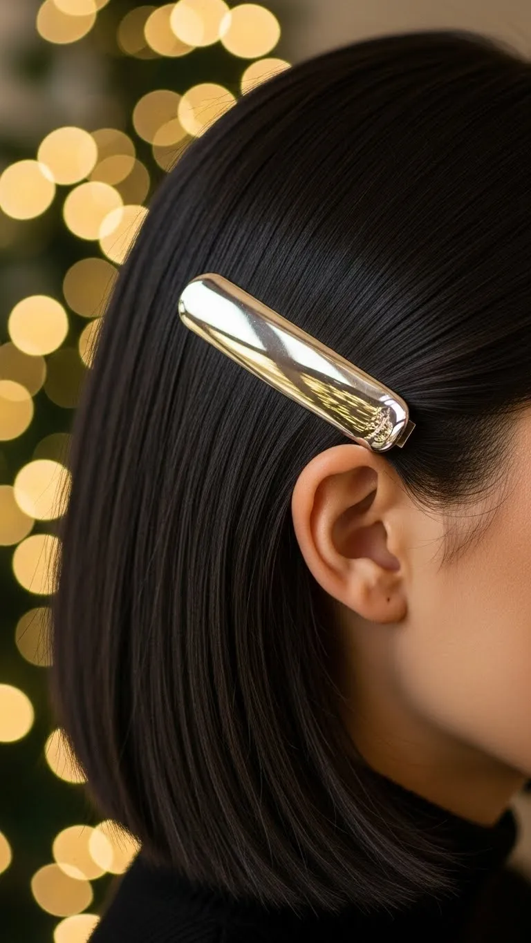 Straighten your lob softly. Tuck one side back and add a metallic barrette. Smooth dry ends with a tiny amount of cream. This quick style looks neat and shines under holiday lighting. Keep a comb for touch-ups.