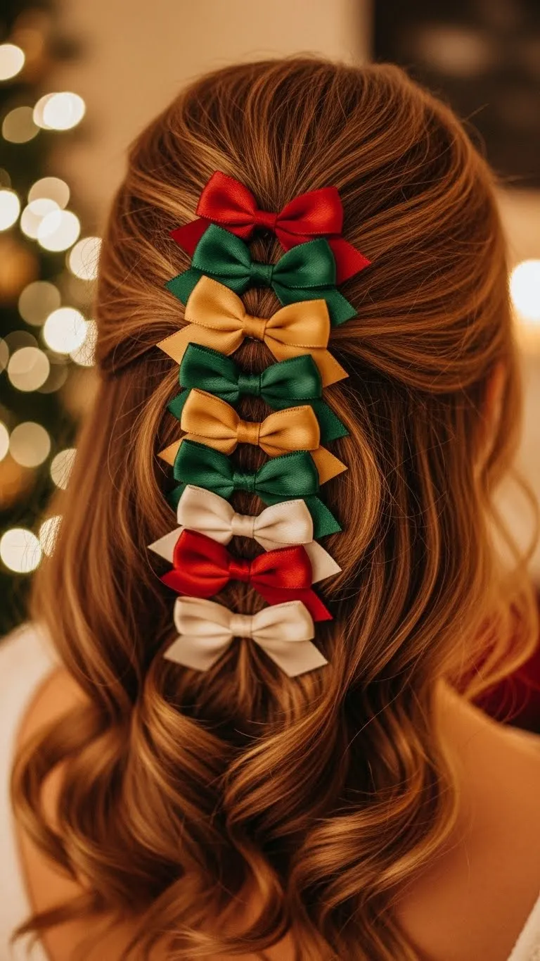 Pull the top half back with an elastic. Attach two or three small bows in a stacked line. Choose festive colors. Curl the ends softly. This playful look works well for family gatherings or photos. Small bows are easy to find at craft stores.