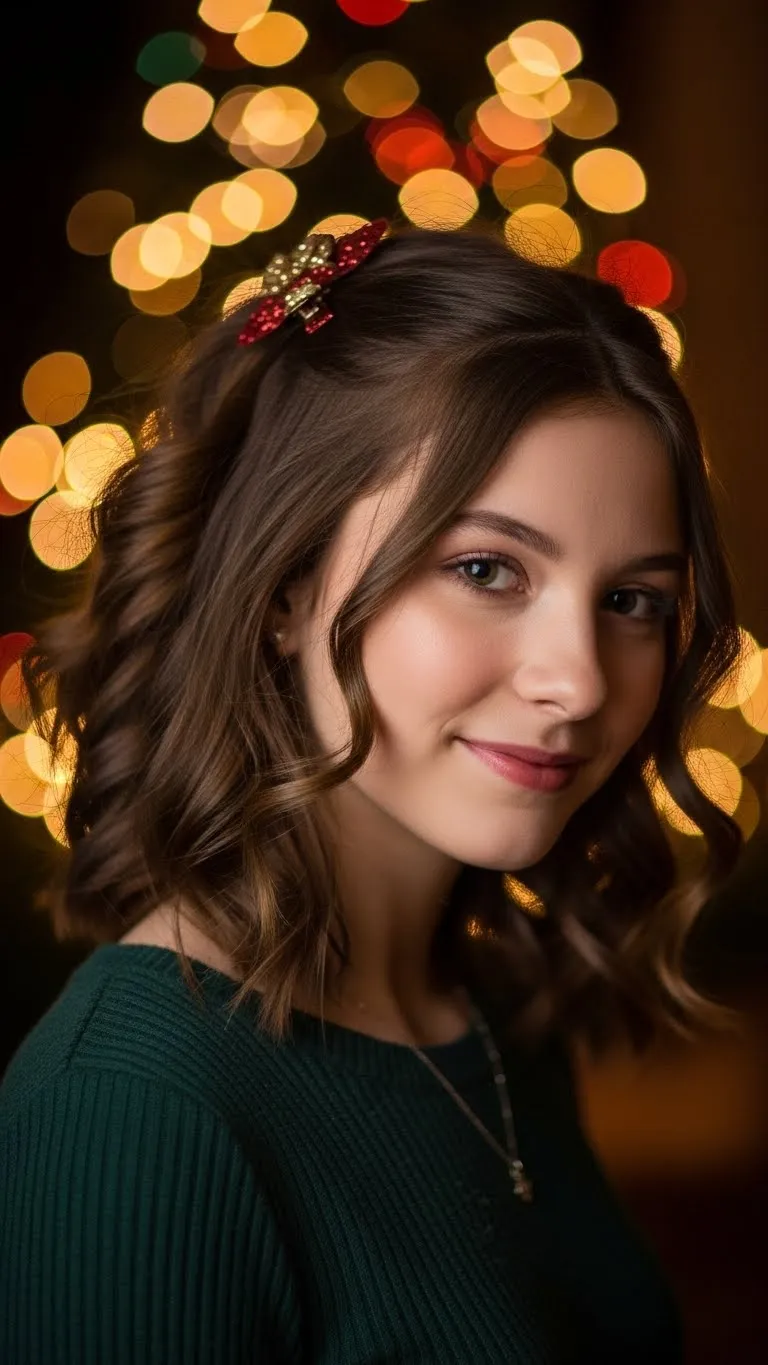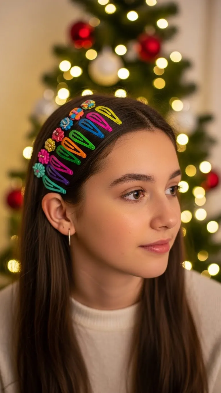 Clip stacking is a popular trend for teens. Gather a few small clips and line them up on one side of your hair. Mix metallic, glitter, or pearl pieces for variety. You don’t need expensive accessories—an inexpensive multi-pack works great. This style looks cute with straight, wavy, or curly hair. It’s perfect for Christmas parties and photos. It adds holiday personality without much effort and stays in place all day.