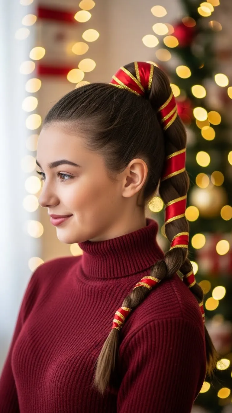 Wrapping a ribbon around a ponytail gives instant holiday charm. Start with a mid or high pony. Take a long piece of ribbon and wind it from top to bottom. Tie it at the end or secure it with a small pin. Teens like this because it’s affordable and creative. Pick colors that match your outfit. It works on straight or curly hair. This style looks great in photos and adds simple holiday flair.