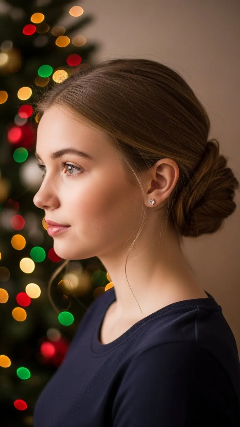 A twisted low bun looks simple and polished without being stiff. Divide your hair into two sections, twist each one back, and pin them into a small bun. Teens love this style because it stays in place even during long gatherings. You can use budget-friendly bobby pins or elastic ties. If you have short hair, make a smaller bun or tuck the ends. Add a sparkly clip on one side to bring in the holiday vibe. It works beautifully with sweaters, dresses, or cozy loungewear.
