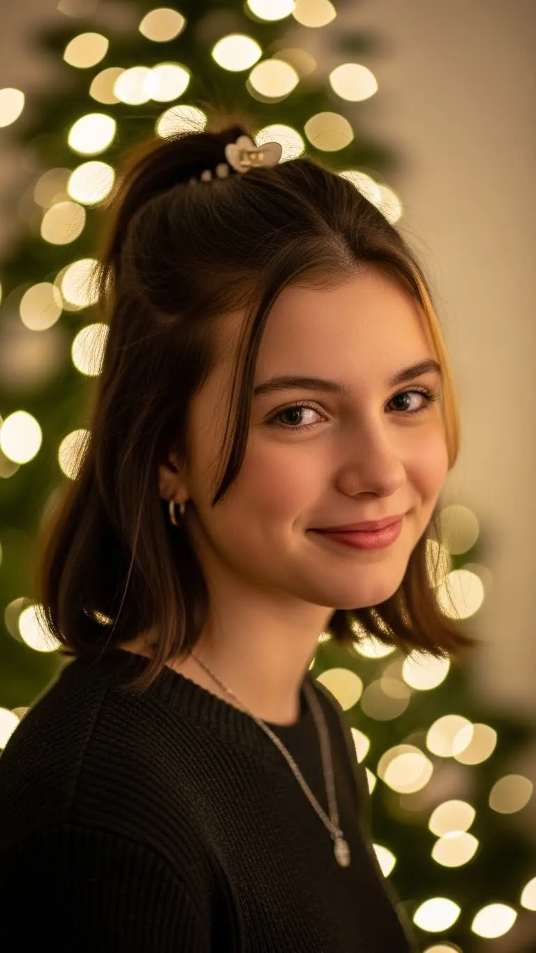 A high pony is a classic teen favorite. Brush your hair upward and secure it tightly. Pull out a couple of face-framing pieces to keep it soft. Curl the ponytail if you want extra movement. Teens with thick hair can wrap a small section around the elastic for a tidy finish. This is a great last-minute choice before a Christmas party. You only need a basic hair tie and maybe a small curling wand. Add a ribbon clip at the base if you want a holiday feel. It’s quick, cute, and works for any outfit.