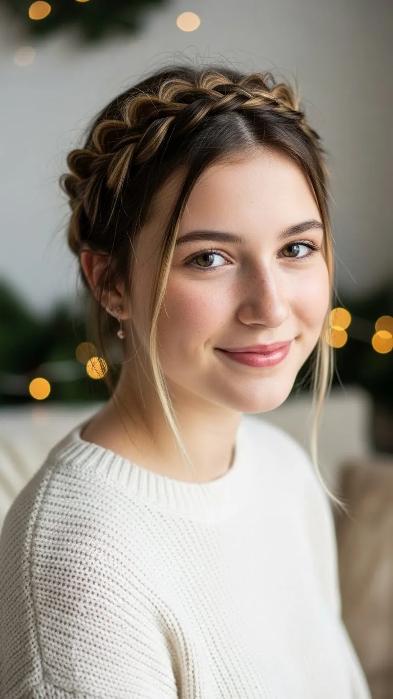 A braided crown accent looks sweet and simple. Take a small section from each side, braid them, and pin them across the top of your head. Leave the rest of your hair down so it stays soft and relaxed. This style works well for wavy or straight textures. Teens who don’t braid often can keep the plaits loose for an easier finish. Add a tiny red or gold pin where the braids meet. It holds well through long events without needing heavy products. You can even use clear elastic bands from a budget pack. This look frames the face softly and works with holiday outfits of any style. It’s also a great second-day hair trick if you don’t feel like washing.