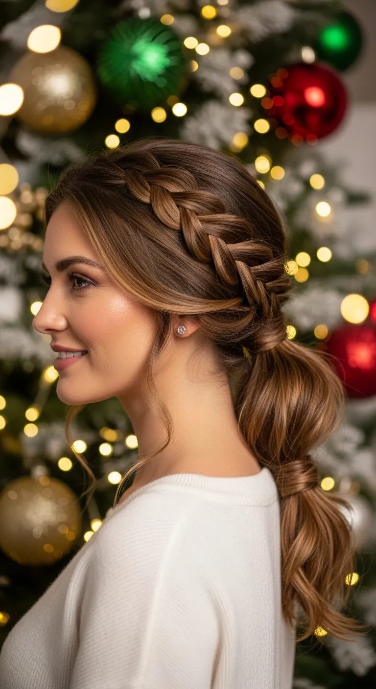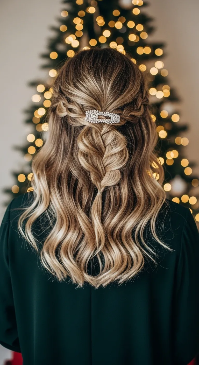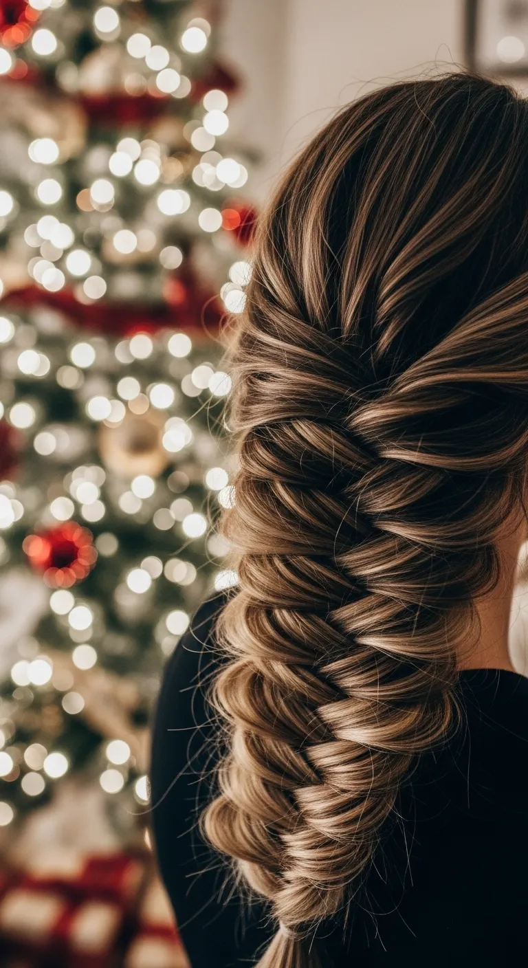 A loose fishtail braid feels soft and festive. Split your hair into two parts. Pull small sections from each side and cross them over. Keep it relaxed. Pull the braid apart gently when finished. Add a ribbon or clip at the end. This style works well for long hair. If your braid slips, use a bit of dry shampoo before starting. It holds shape and adds body.