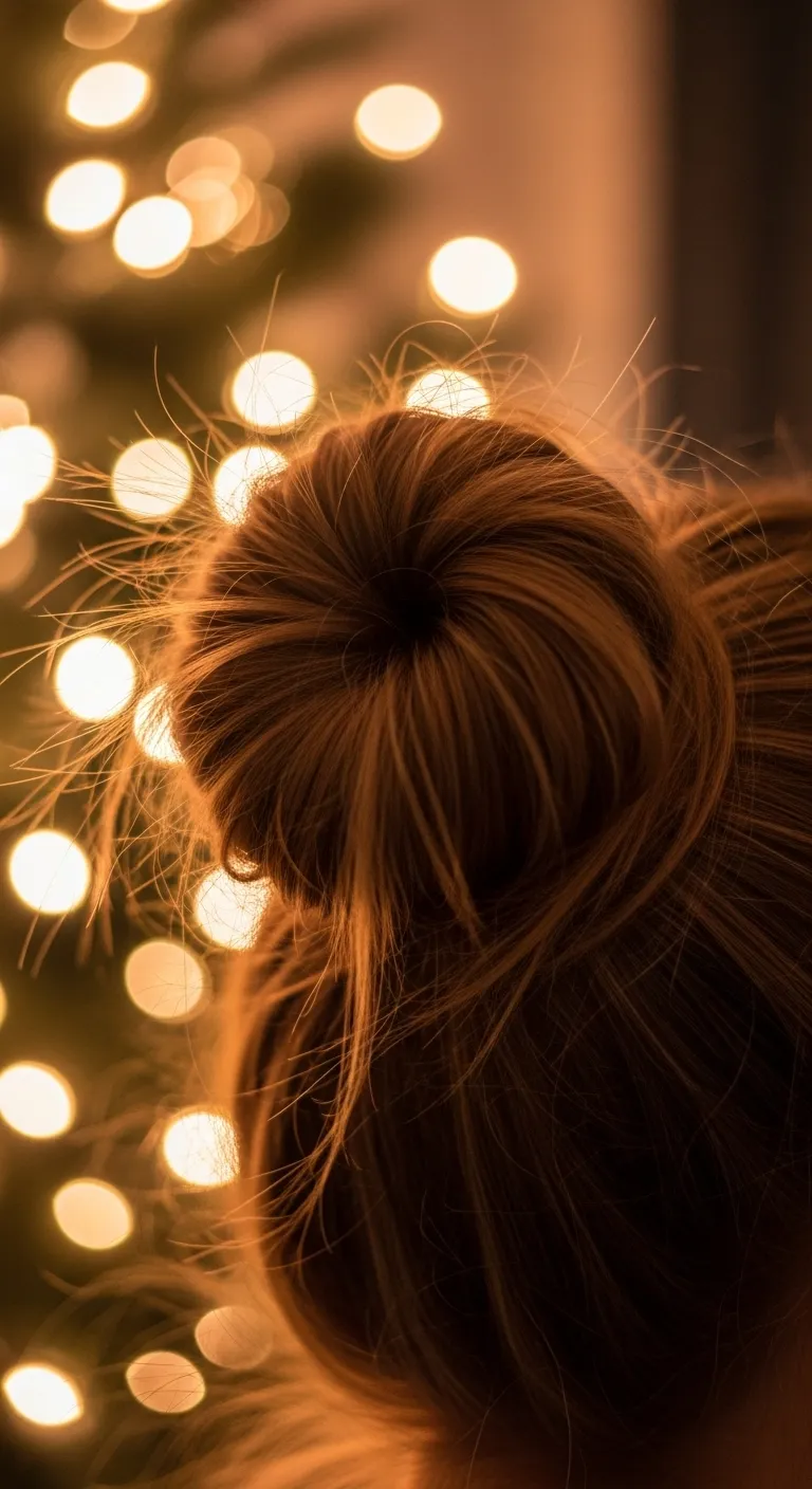 A messy bun is relaxed and easy. Pull your hair into a loose bun and pin it in a few spots. Tug at small sections to give it shape. Leave a few strands around your face for softness. Add a thin ribbon if you want a festive detail. Dry shampoo helps add body and grip. This style works great when you’re rushing to get ready. It looks good with oversized sweaters and cozy winter outfits.